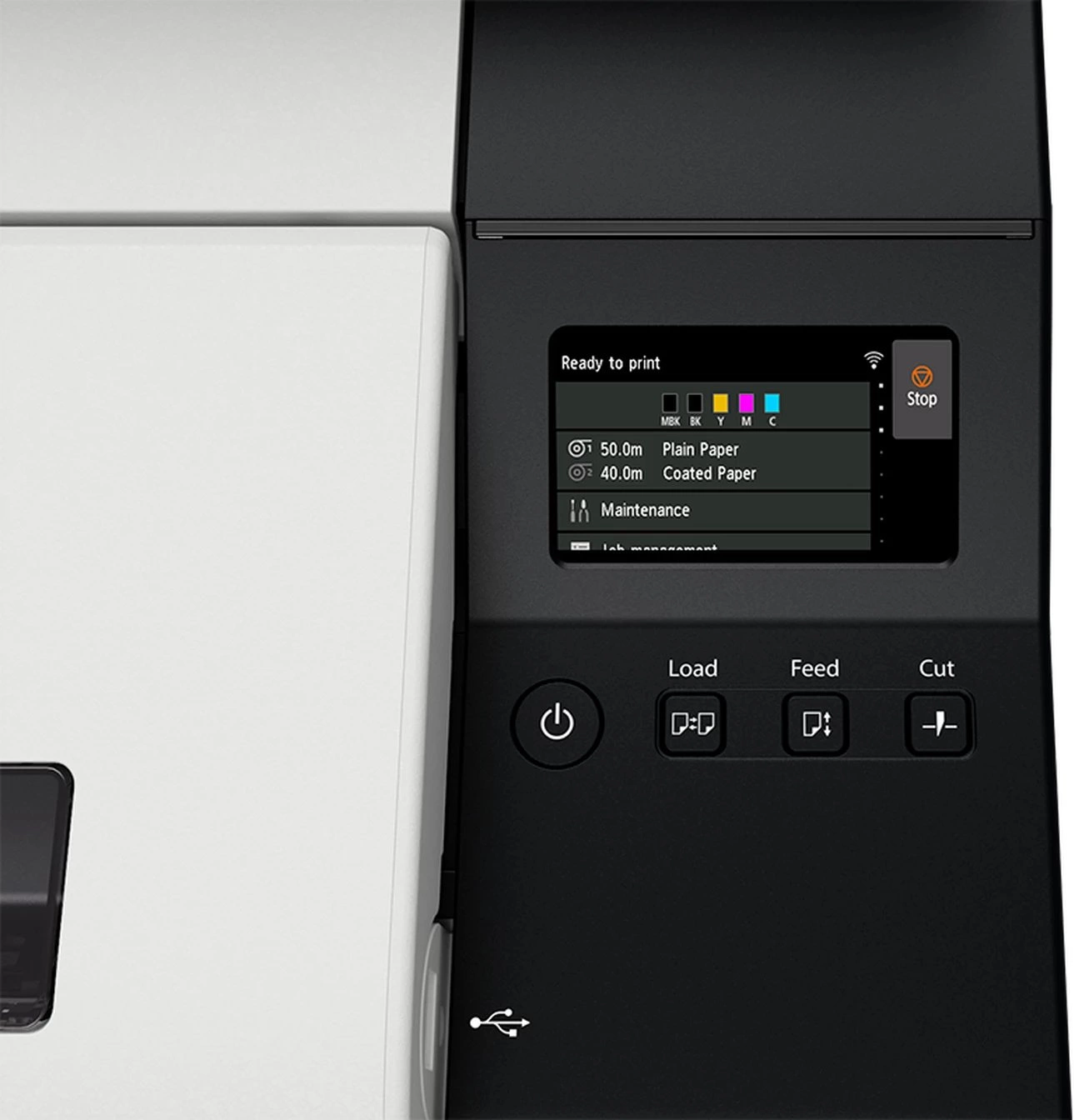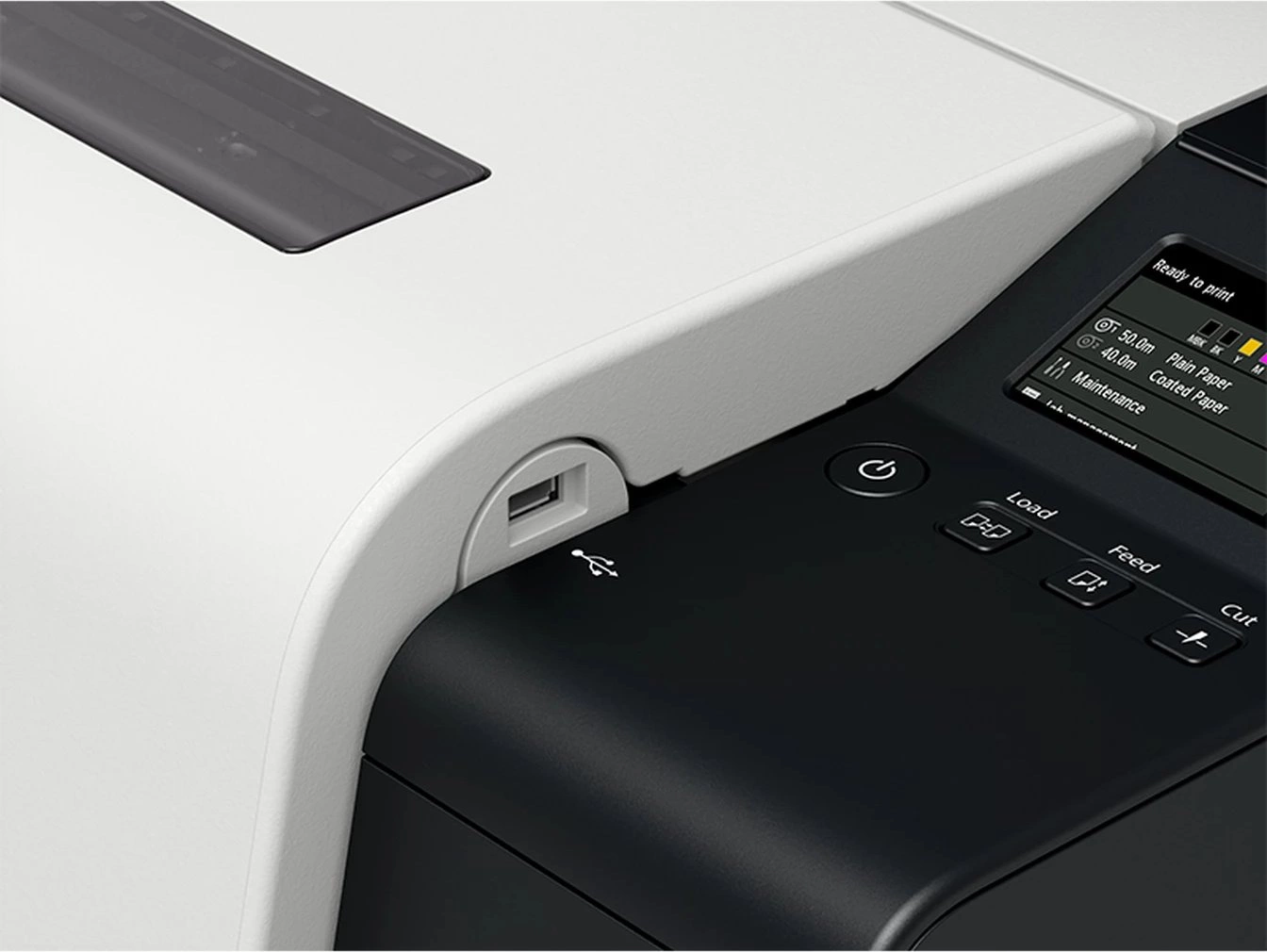 Виртуальная память 128 ГБ, Комплектация: плоттер, печатающая головка, держатель рулона, 3-дюймовая бумажная гильза, Стартовый набор чернил: 330 мл (MBK)/160 мл (BK, C, M, Y), диск с ПО, руководство по настройке