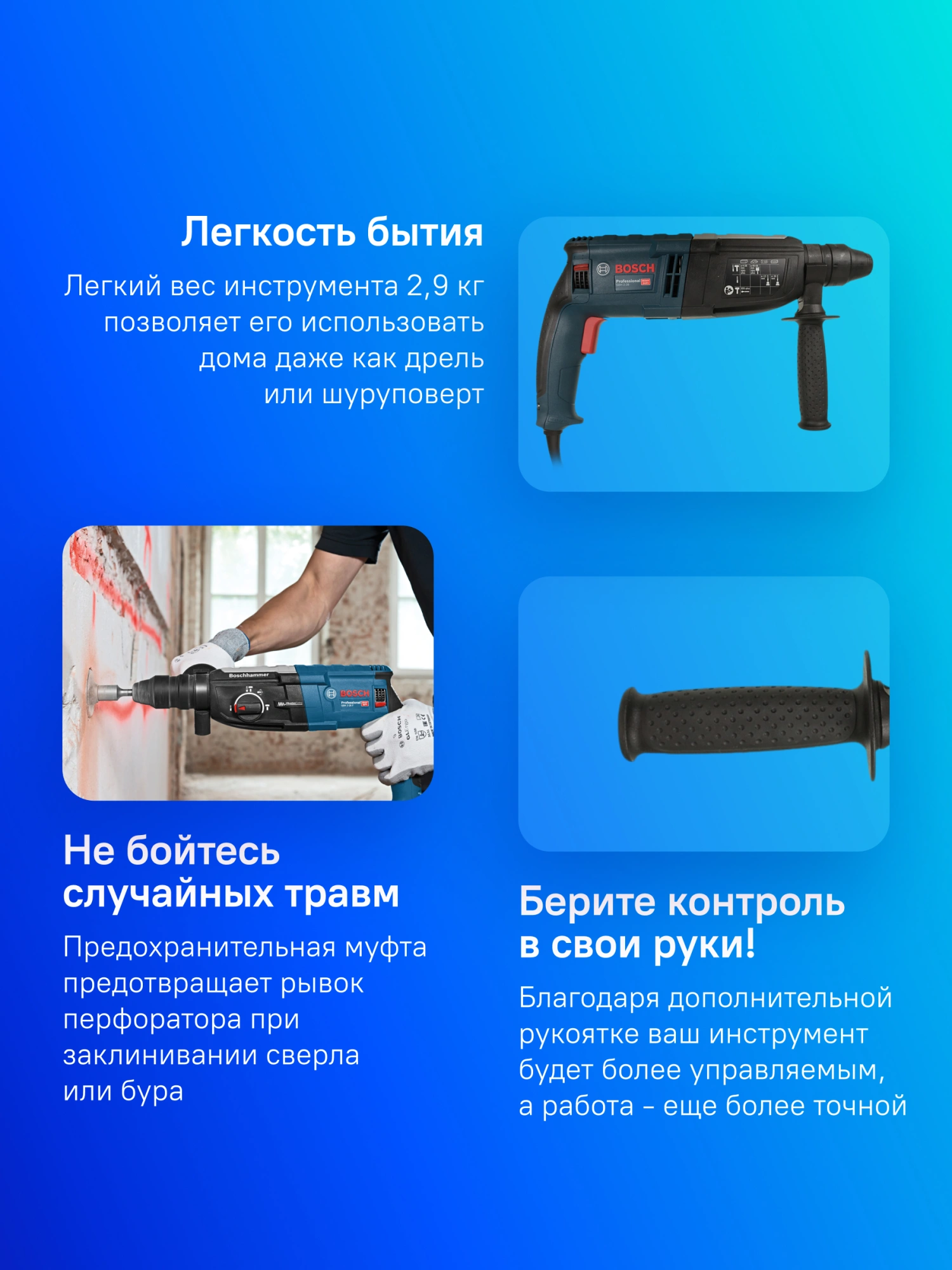 Перфоратор Bosch GBH 2-28, ограничитель глубины 210 мм., дополнительная рукоятка, салфетка, инструкция, кейс.