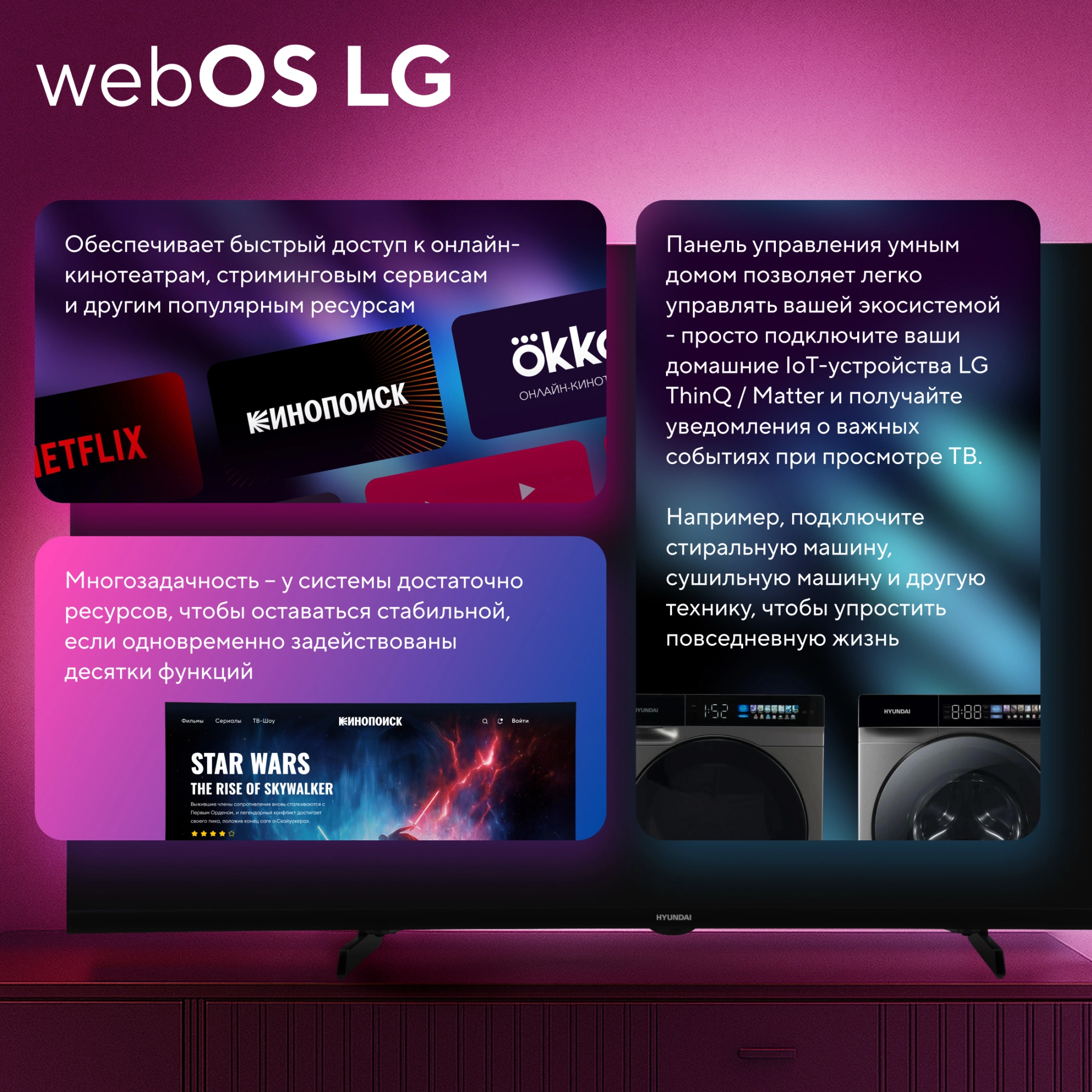 Встроенная операционная система WebOS TV позволяет легко находить контент на вашем любимом стриминговом сервисе или в интернете. Smart TV также предоставляет доступ к приложениям и сервисам, таким как YouTube, Netflix, Amazon Prime Video и другим.