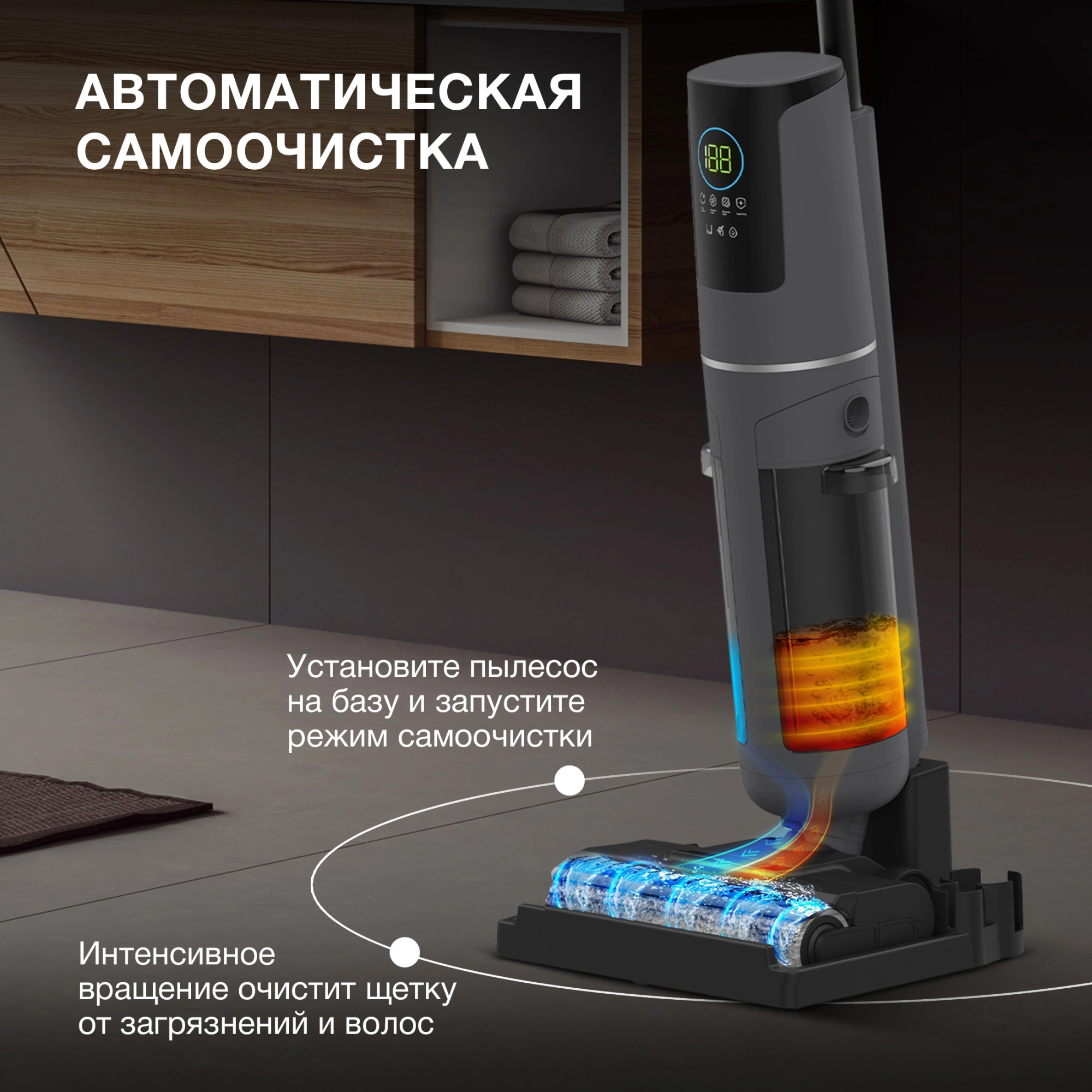 Моющий пылесос HYV-S01AQUA оснащён функцией автоматической самоочистки. Для этого необходимо установить пылесос на базу и запустить специальный режим. Интенсивное вращение очистит щетку от загрязнений и волос.