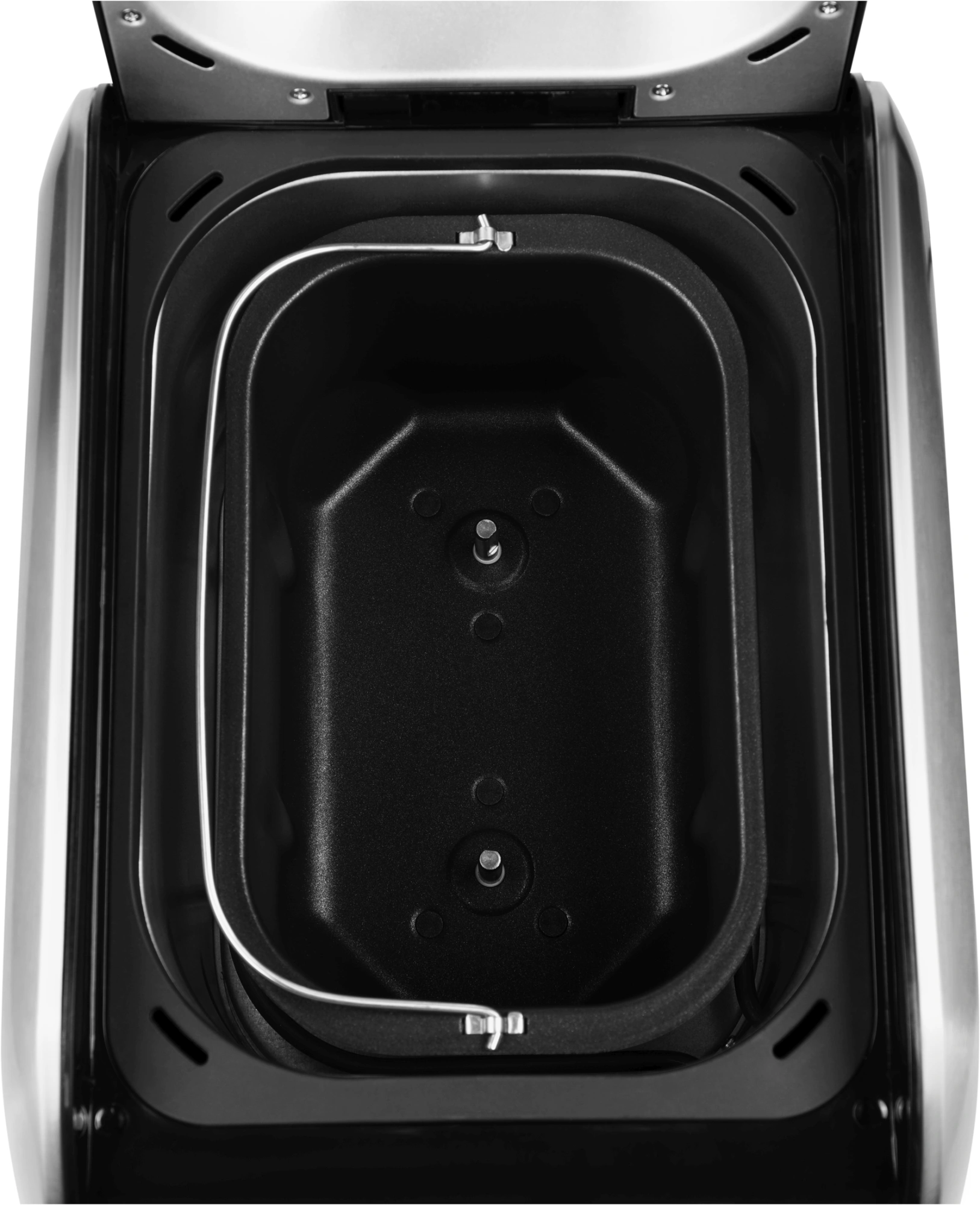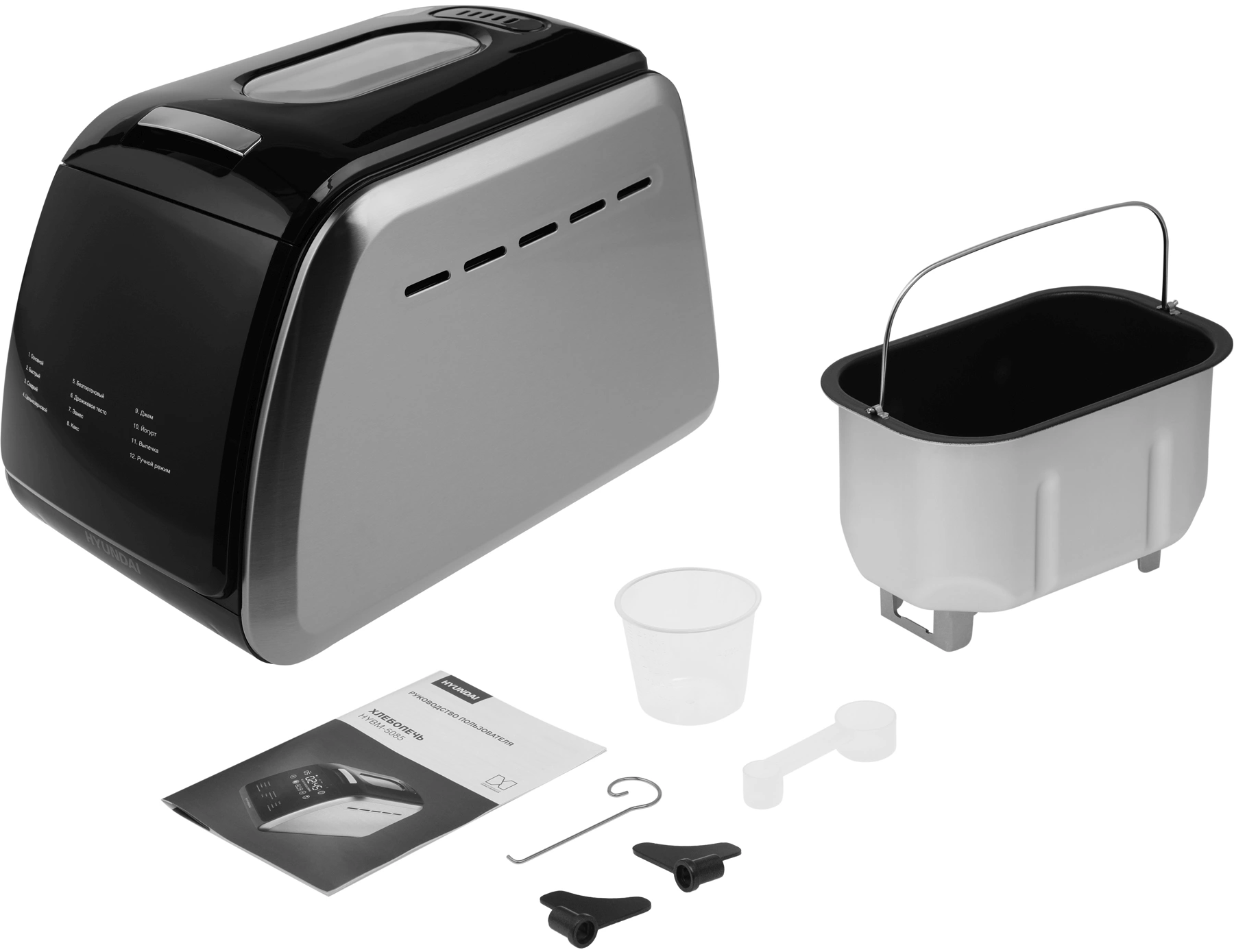Продуманные детали: Антипригарное покрытие формы облегчает извлечение выпечки, а окно контроля процесса позволяет следить за приготовлением. В комплекте предоставляется лопасть для замешивания теста, крюк чтобы ее вынимать, мерная ложка и стакан.