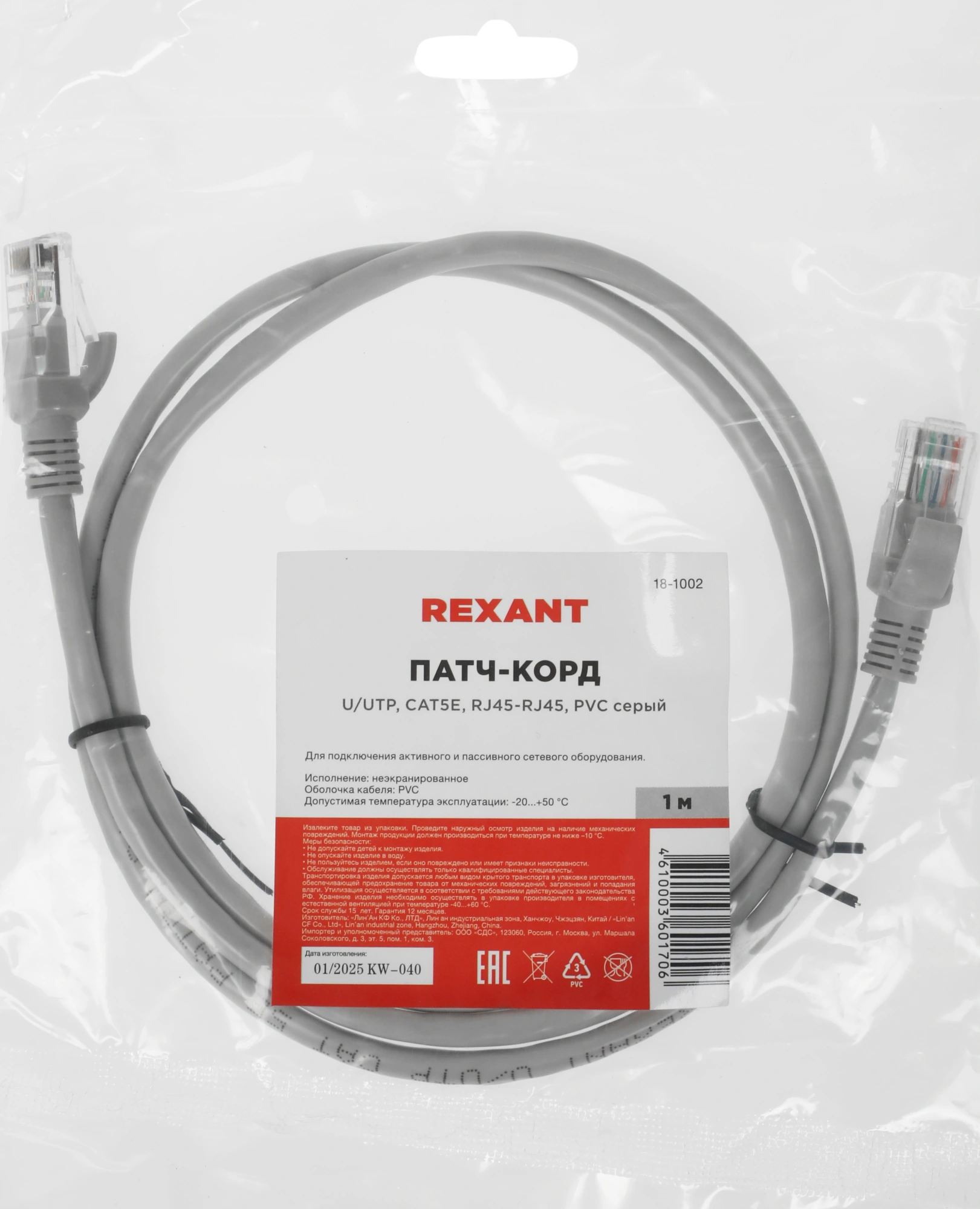 Патч-корд Rexant 18-1002 UTP RJ-45 вил.-RJ-45 мод. кат.5E 1м серый ПВХ