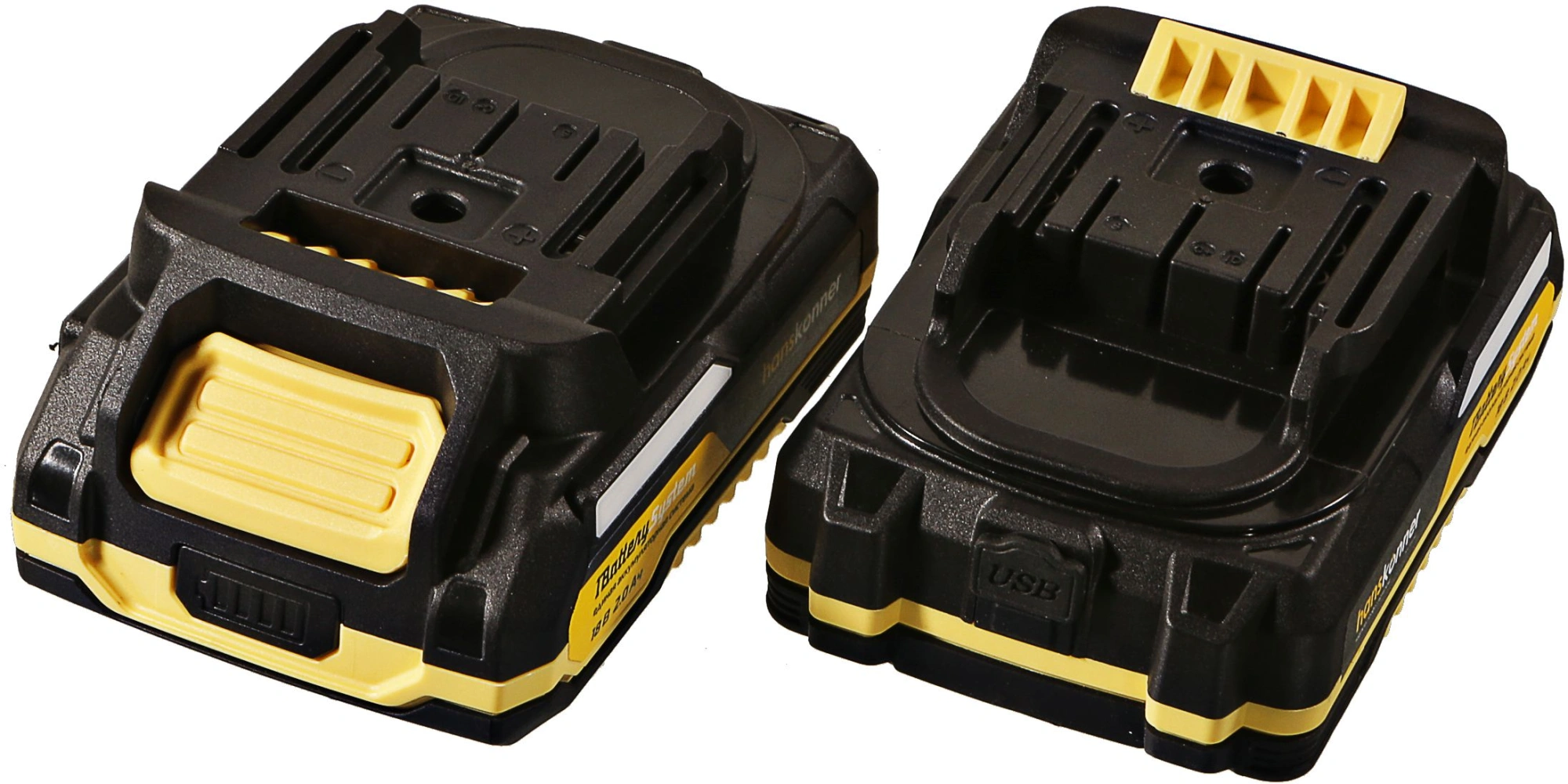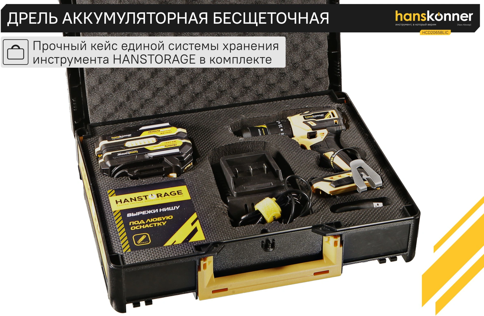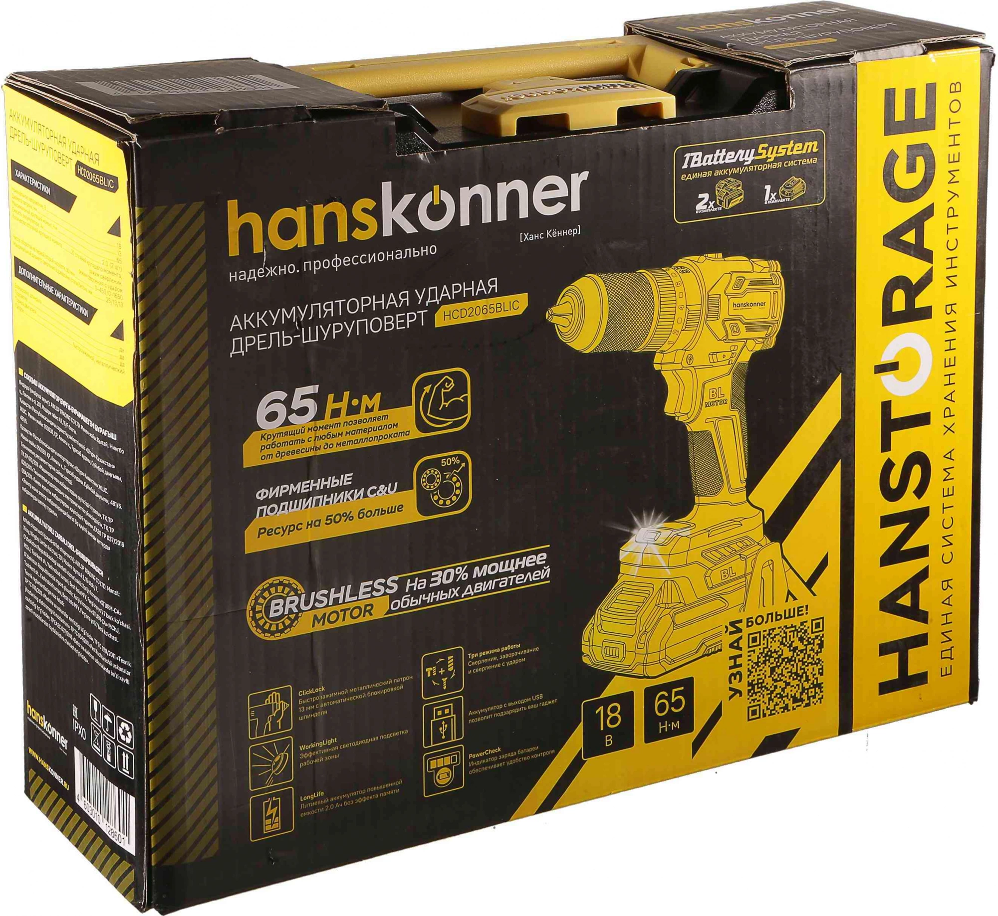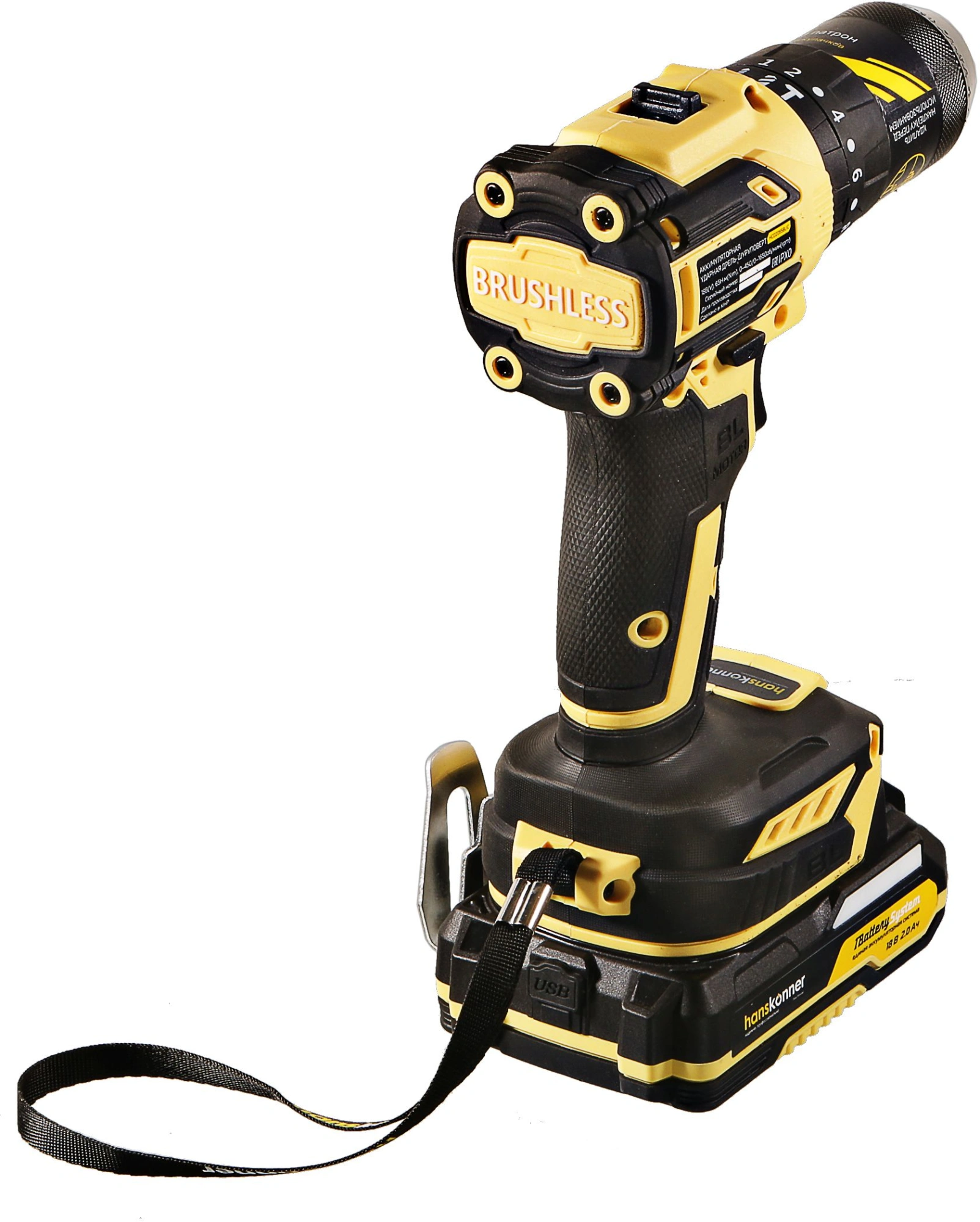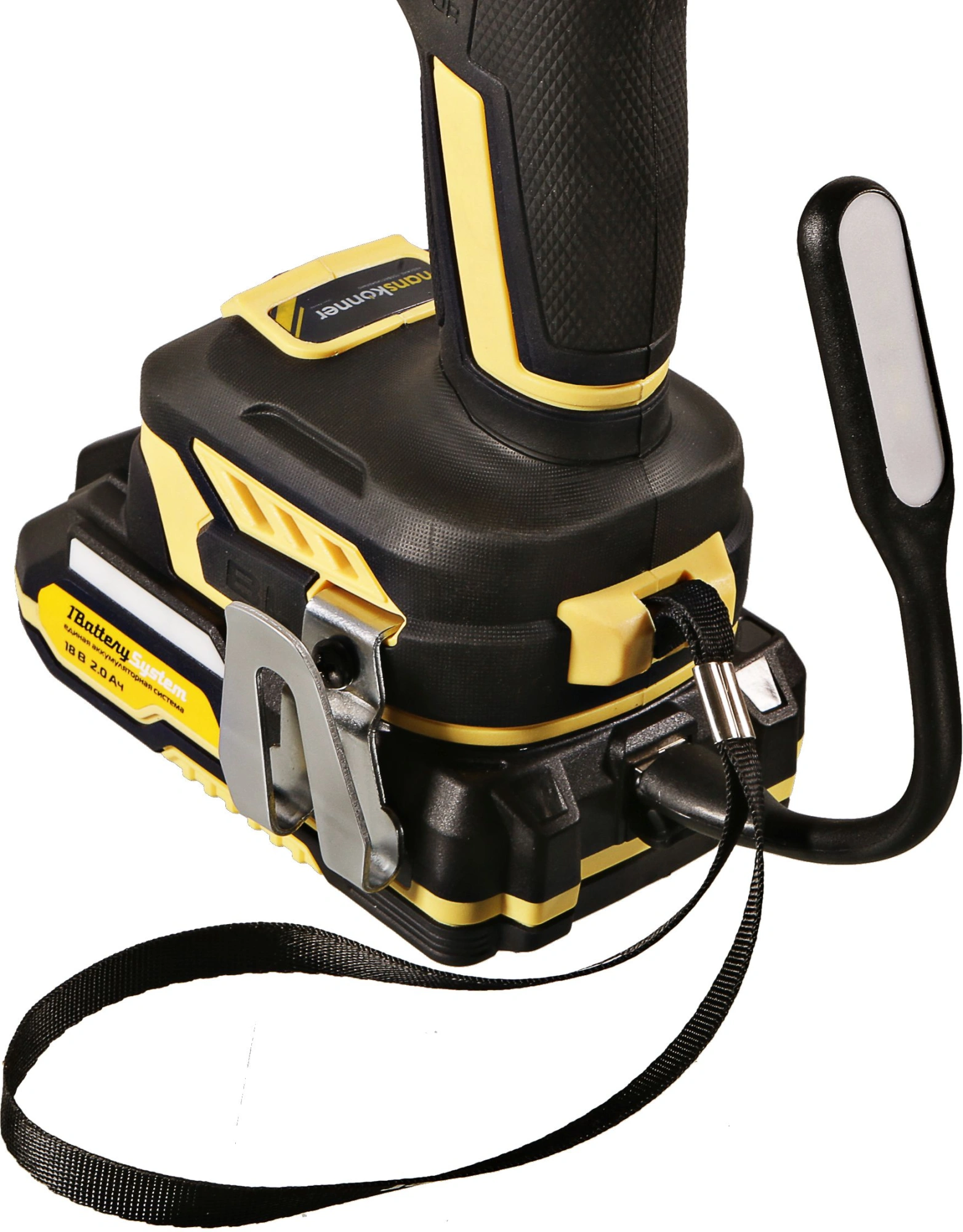 Аккумуляторная ударная дрель-шуруповерт, аккумуляторная батарея (2 шт.), зарядное устройство, двусторонняя бита, скоба, фиксирующий винт, USB LED-фонарик, пластиковый кейс, инструкция по безопасности, инструкция по эксплуатации.