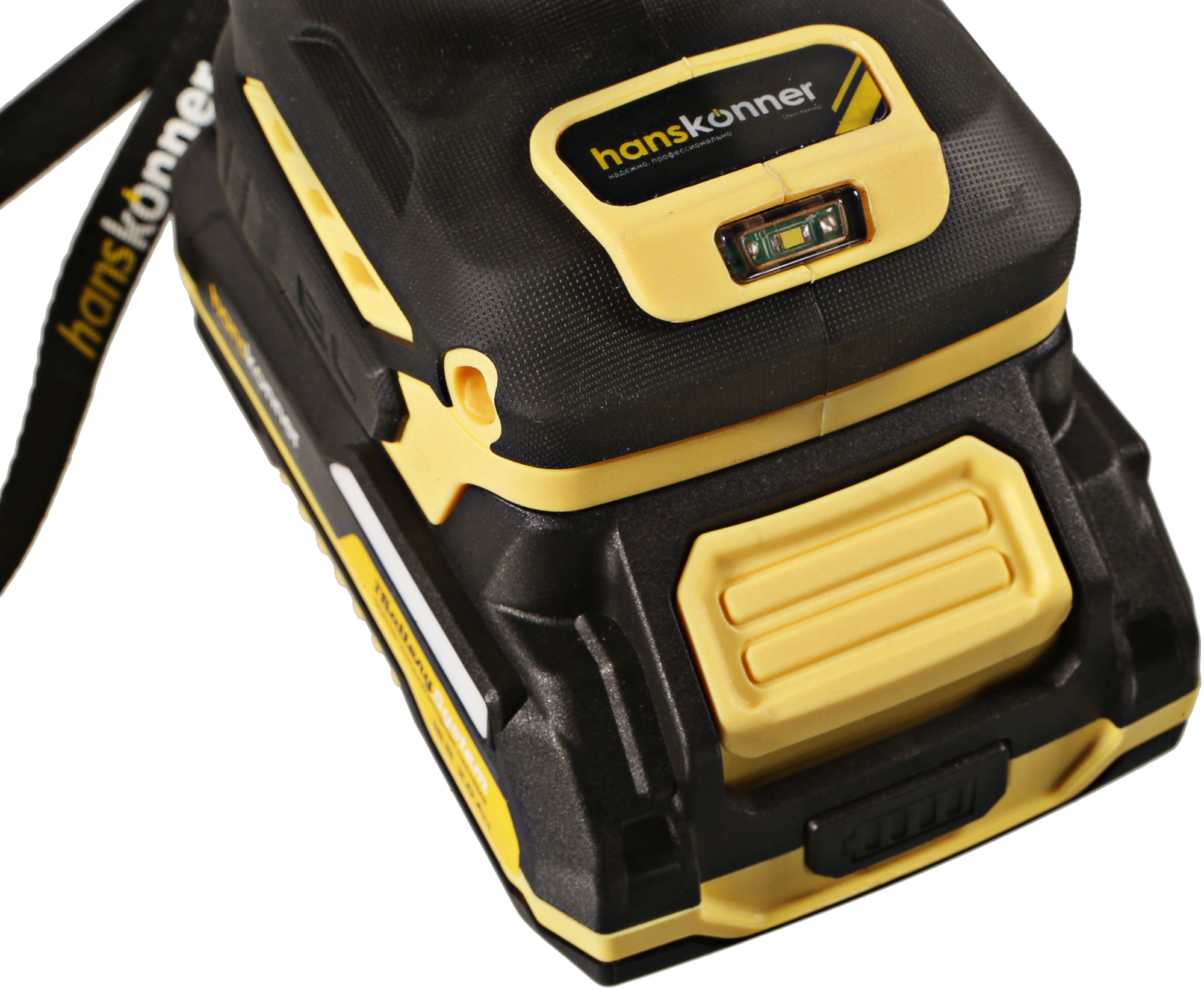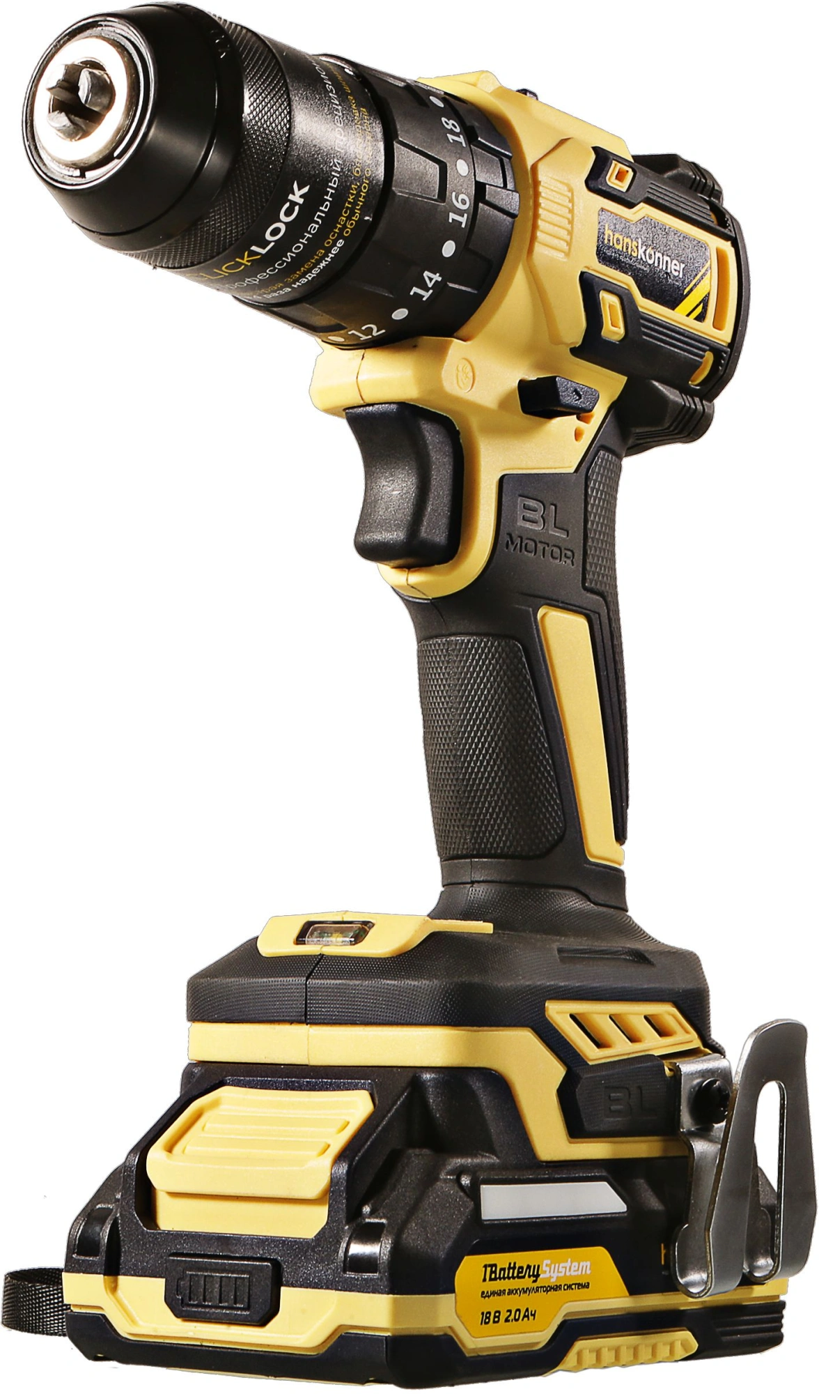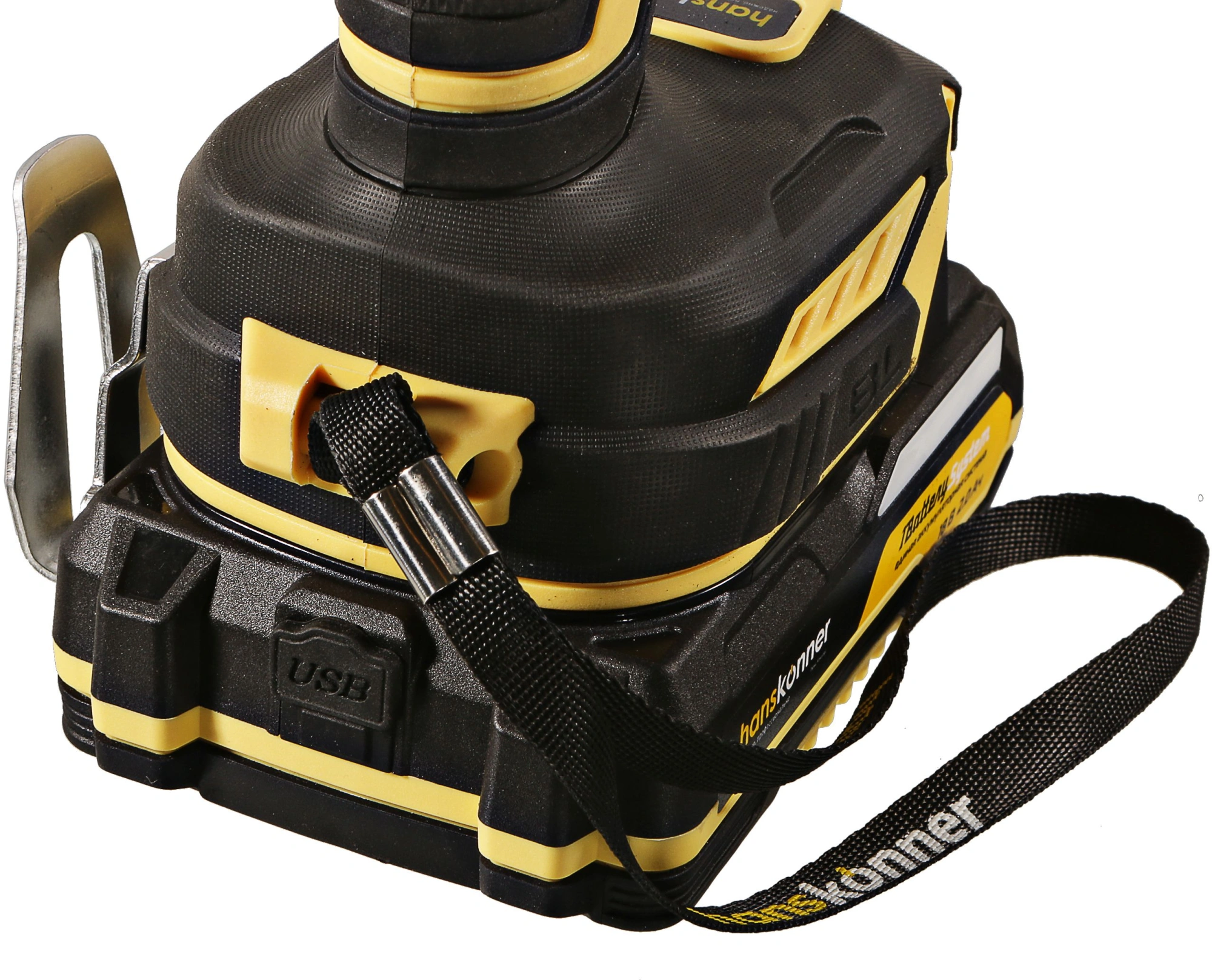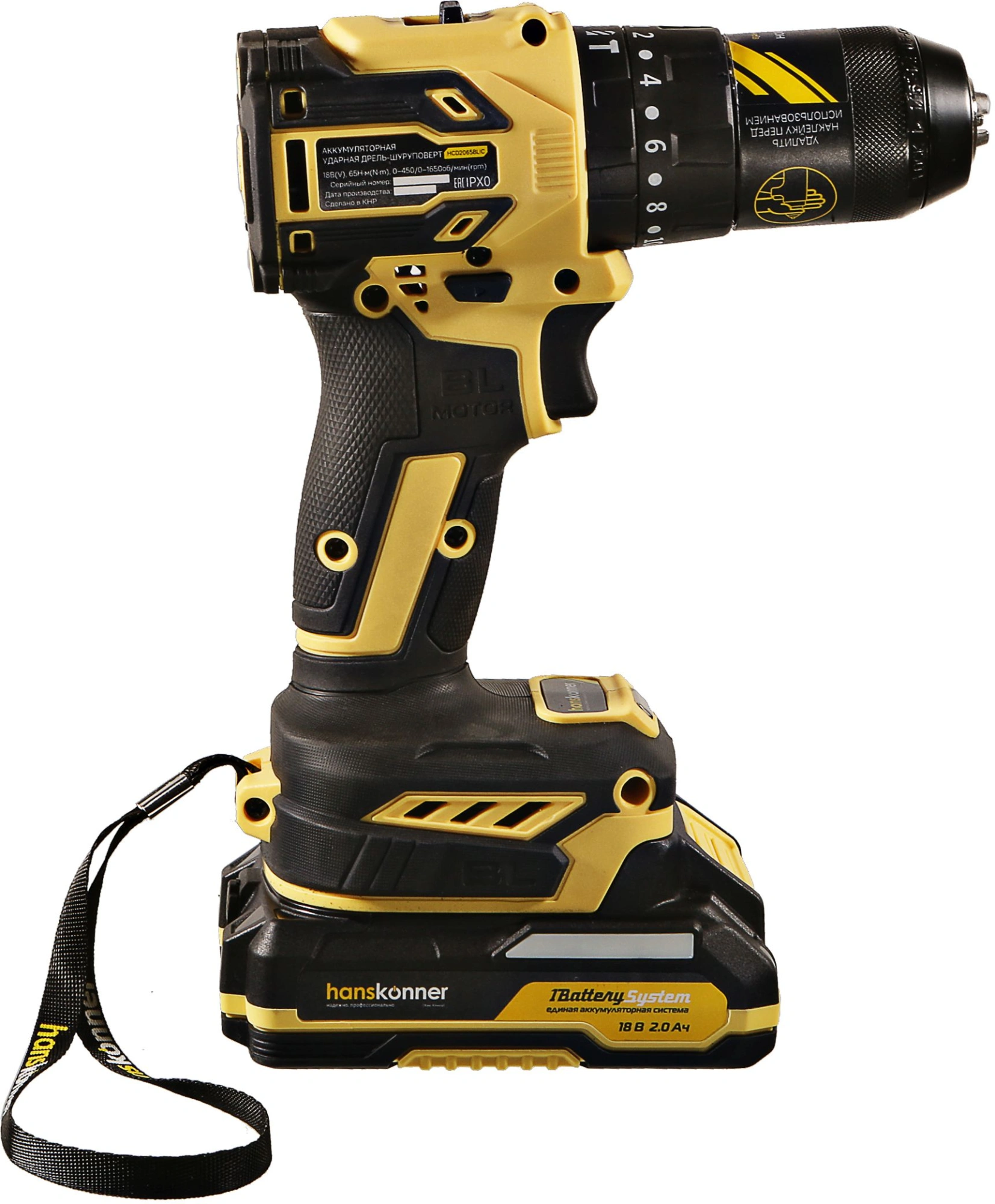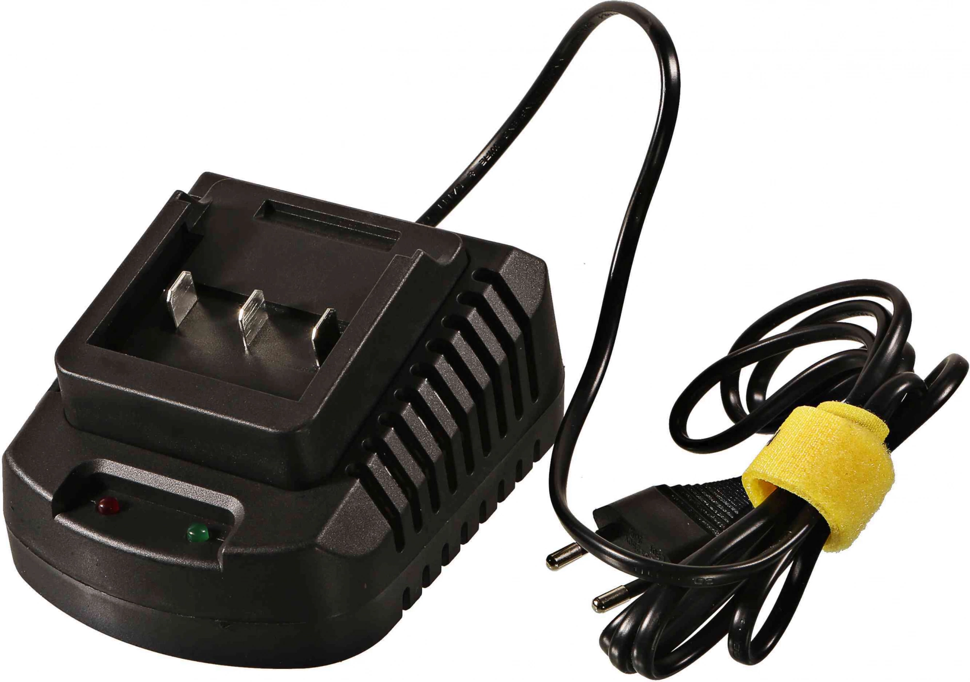 Аккумуляторная ударная дрель-шуруповерт, аккумуляторная батарея (2 шт.), зарядное устройство, двусторонняя бита, скоба, фиксирующий винт, USB LED-фонарик, пластиковый кейс, инструкция по безопасности, инструкция по эксплуатации.