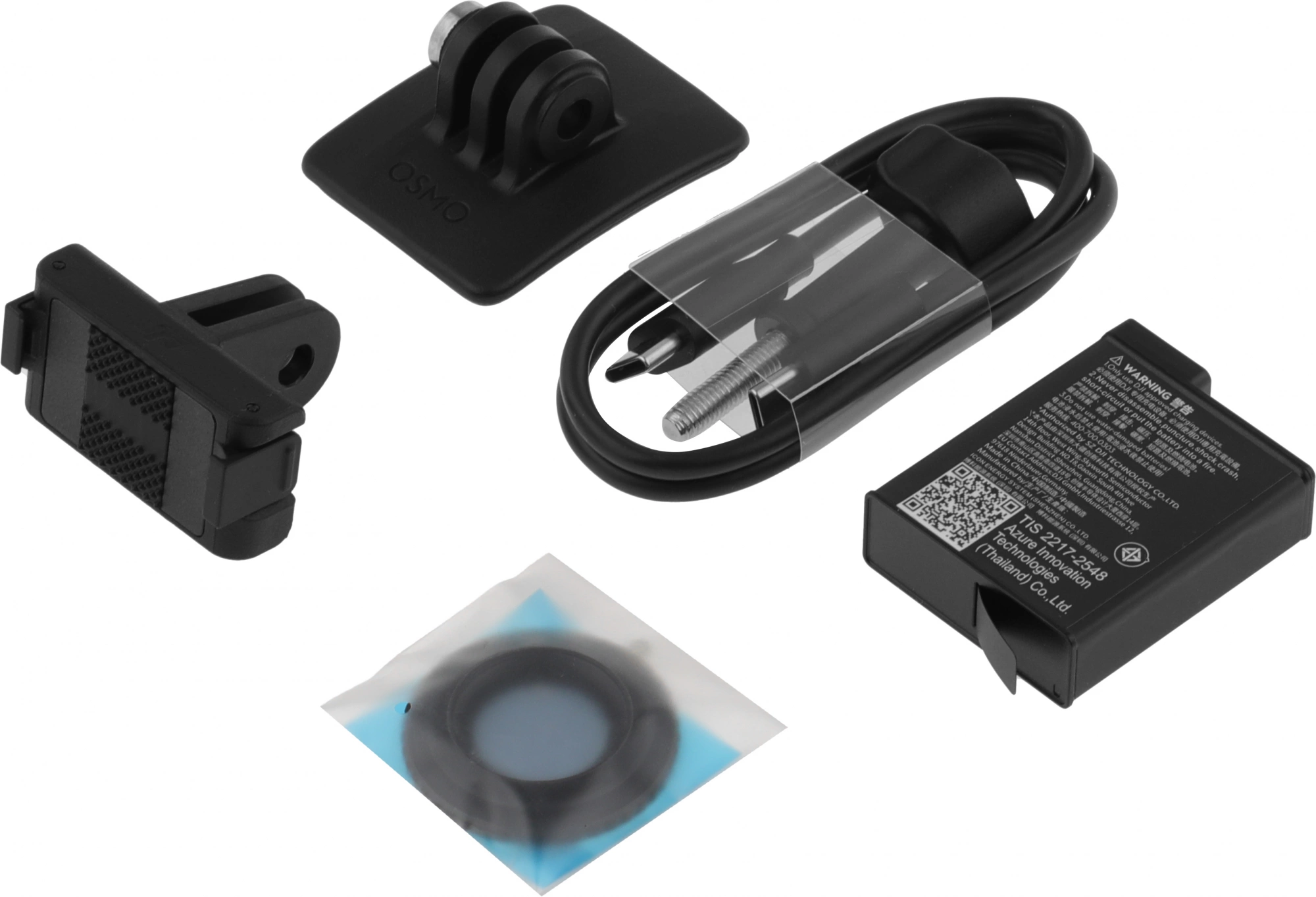 Экшн-камера Osmo Action 4. Магнитное крепление с пряжкой. Магнитная основа для крепления. Аккумулятор. Кабель USB-C. Винт с накатанной головкой.