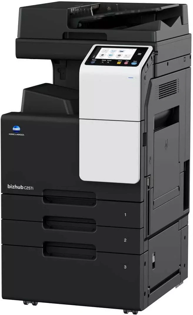 Базовое устройство, 2 лотка подачи по 500 листов, выходной лоток на 250 листов, лоток ручной подачи на 100 листов, жесткий диск на 256 ГБ, автоматическая двусторонняя печать, сетевая печать, сканирование на сервер или e-mail, PS/PCL принт-контроллер