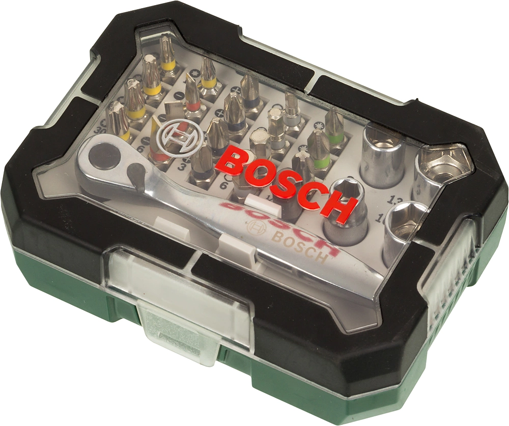 Набор бит с ключом-трещеткой.Торцевые головки: 6, 8, 10, 13 мм;Биты длиной 25 мм: PH1, 2 х PH2, PH3, PZ1, PZ2, PZ3, SL4, SL5, SL6, T10, T15, T20, T25, T30, HEX3, HEX4, HEX5, HEX6.