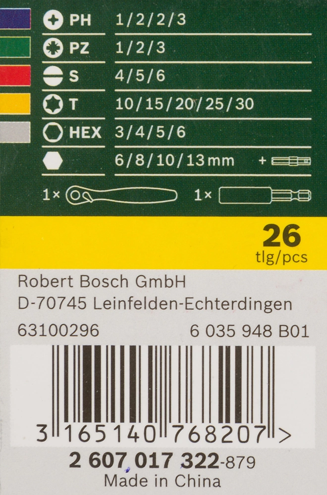 Биты длиной 25 мм: PH1, 2 х PH2, PH3, PZ1, PZ2, PZ3, SL4, SL5, SL6, T10, T15, T20, T25, T30, HEX3, HEX4, HEX5, HEX6.