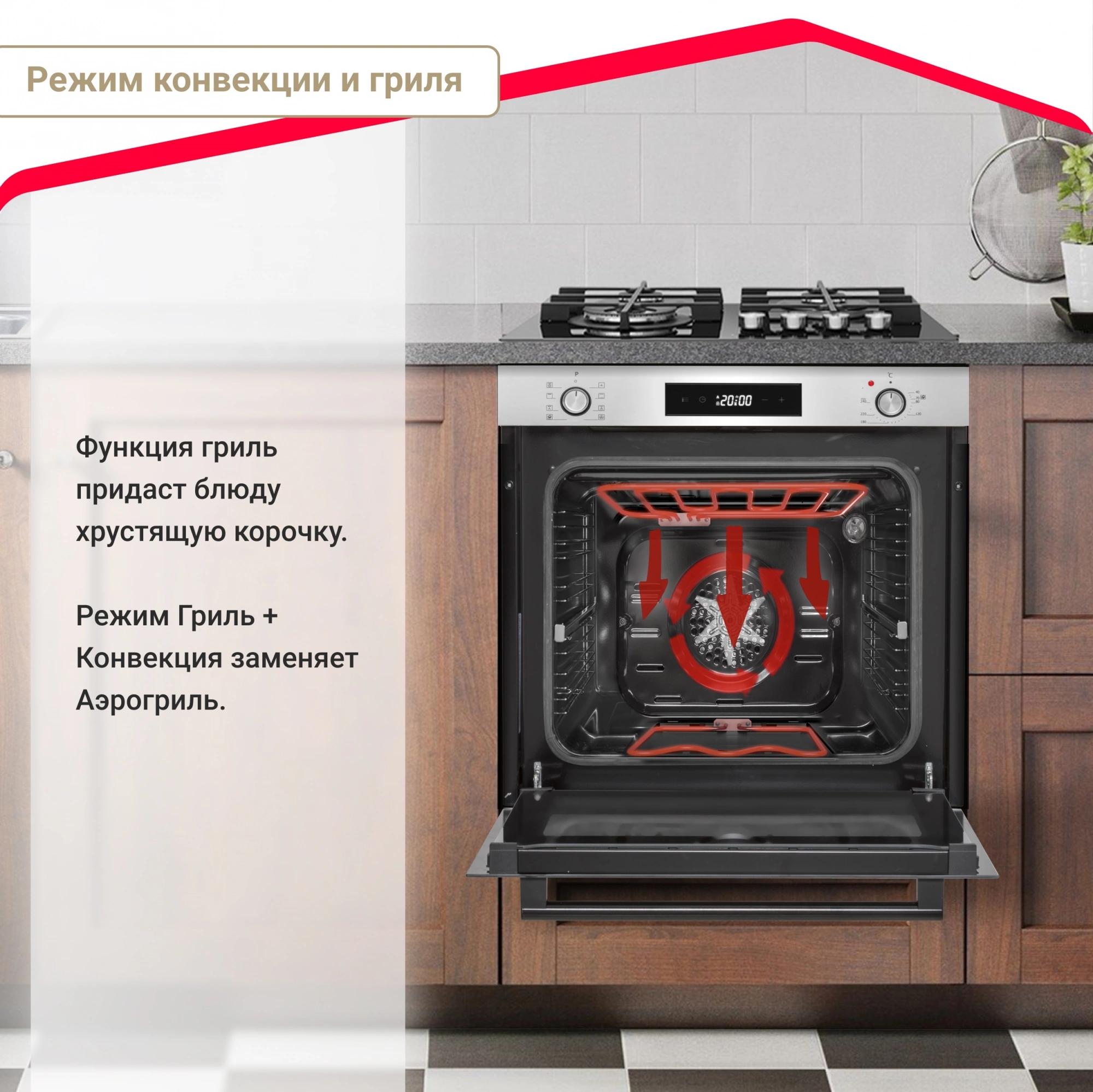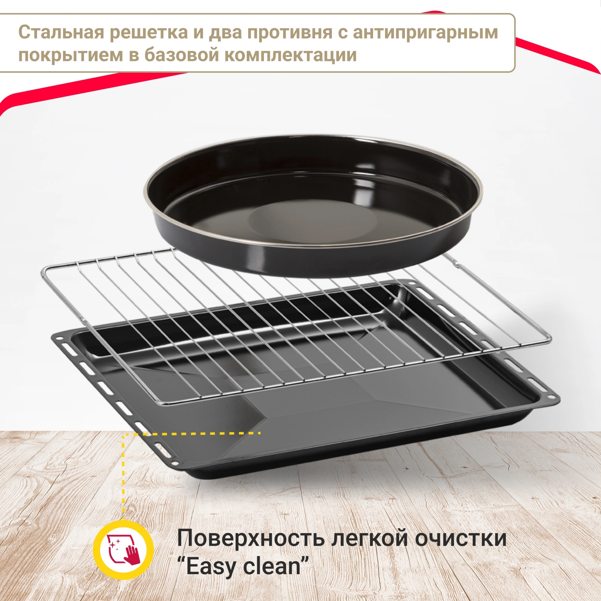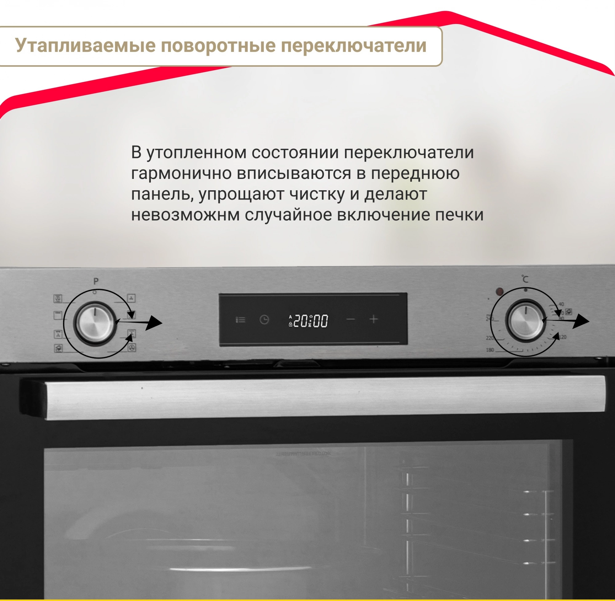 дисплей, полностью стеклянная внутренняя поверхность дверцы духовки, телескопические направляющие, утапливаемые переключатели