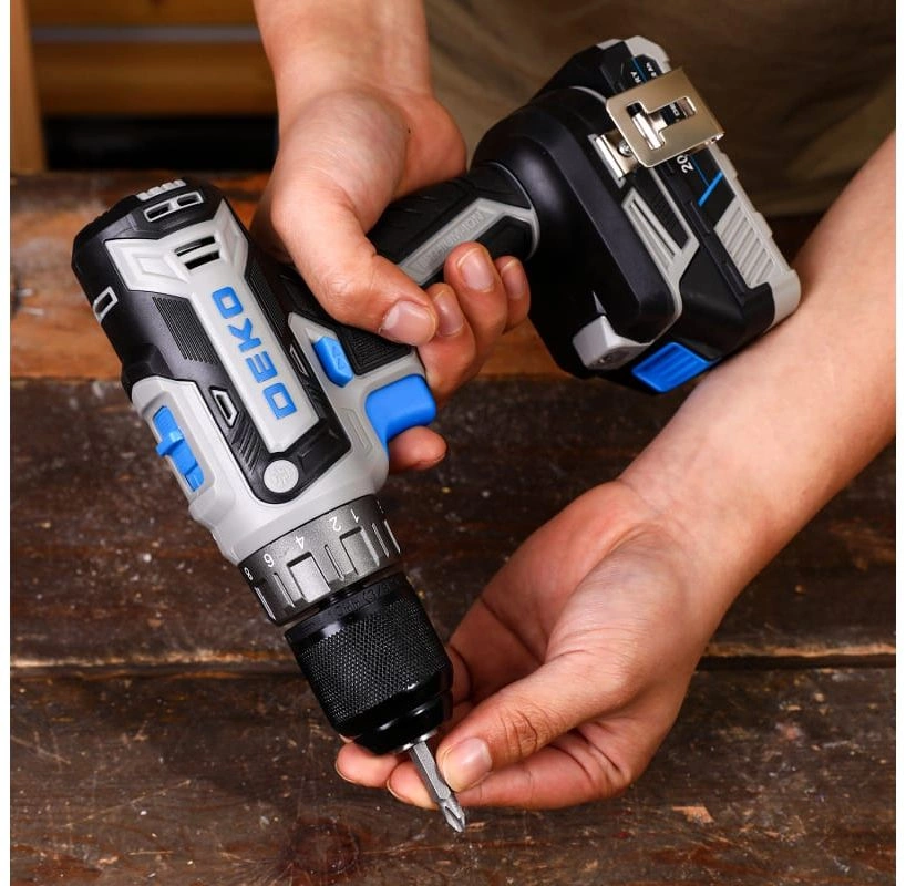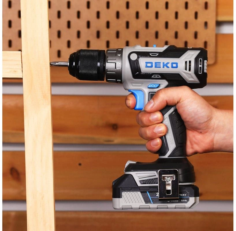 Дрель-шуруповерт, АКБ, зарядное устройство, крючок для ремня, руководство по эксплуатации.