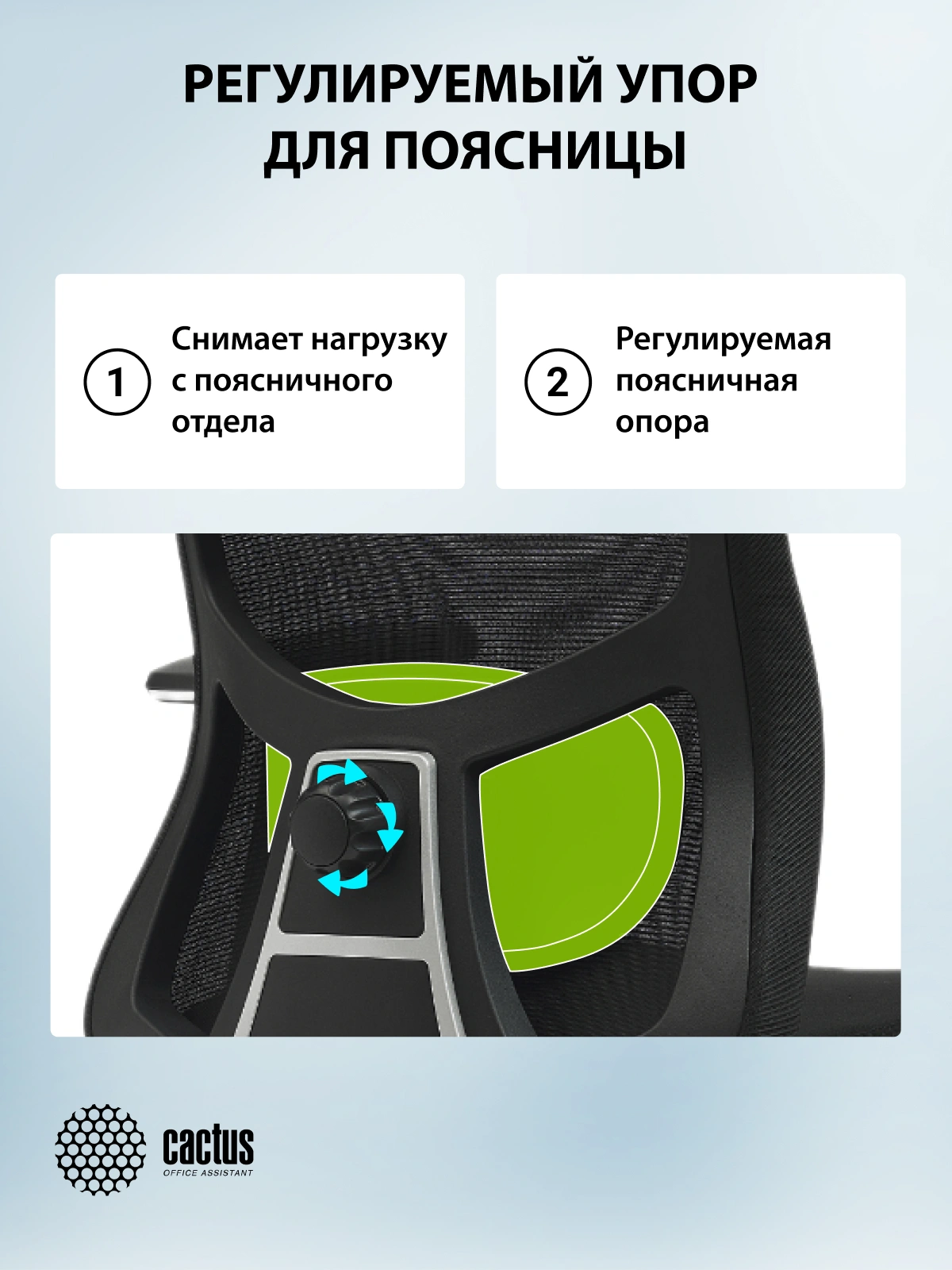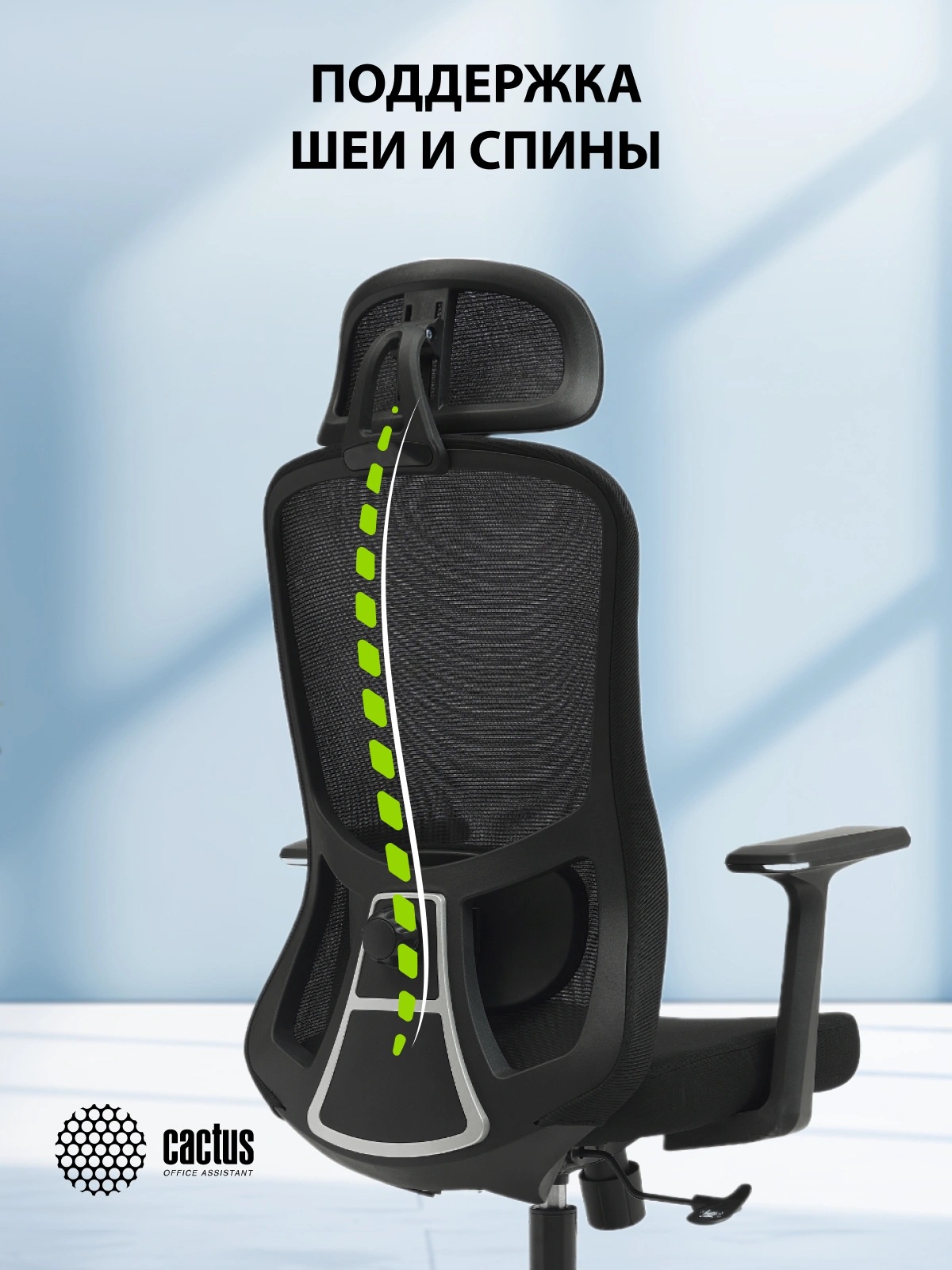 Офисное кресло CS-MC515-BK с высокой, изогнутой спинкой – отличное решение для работы в офисе и дома. Сетчатый материал спинки позволяет креслу «дышать», изогнутая форма обеспечивает поддержку спины, а подголовник и механизм качания дают возможность пользователю откинуть спинку кресла и отдохнуть. Чёрный каркас в комбинации с черной обивкой – это универсальное решение для офиса и дома, а вариант с ярко-голубой обивкой кресла, безусловно, станет ярким акцентом в интерьере. Отличительной особенностью данного кресла является функция поддержки поясницы – с помощью специальной ручки подушку можно зафиксировать в любом удобном положении.