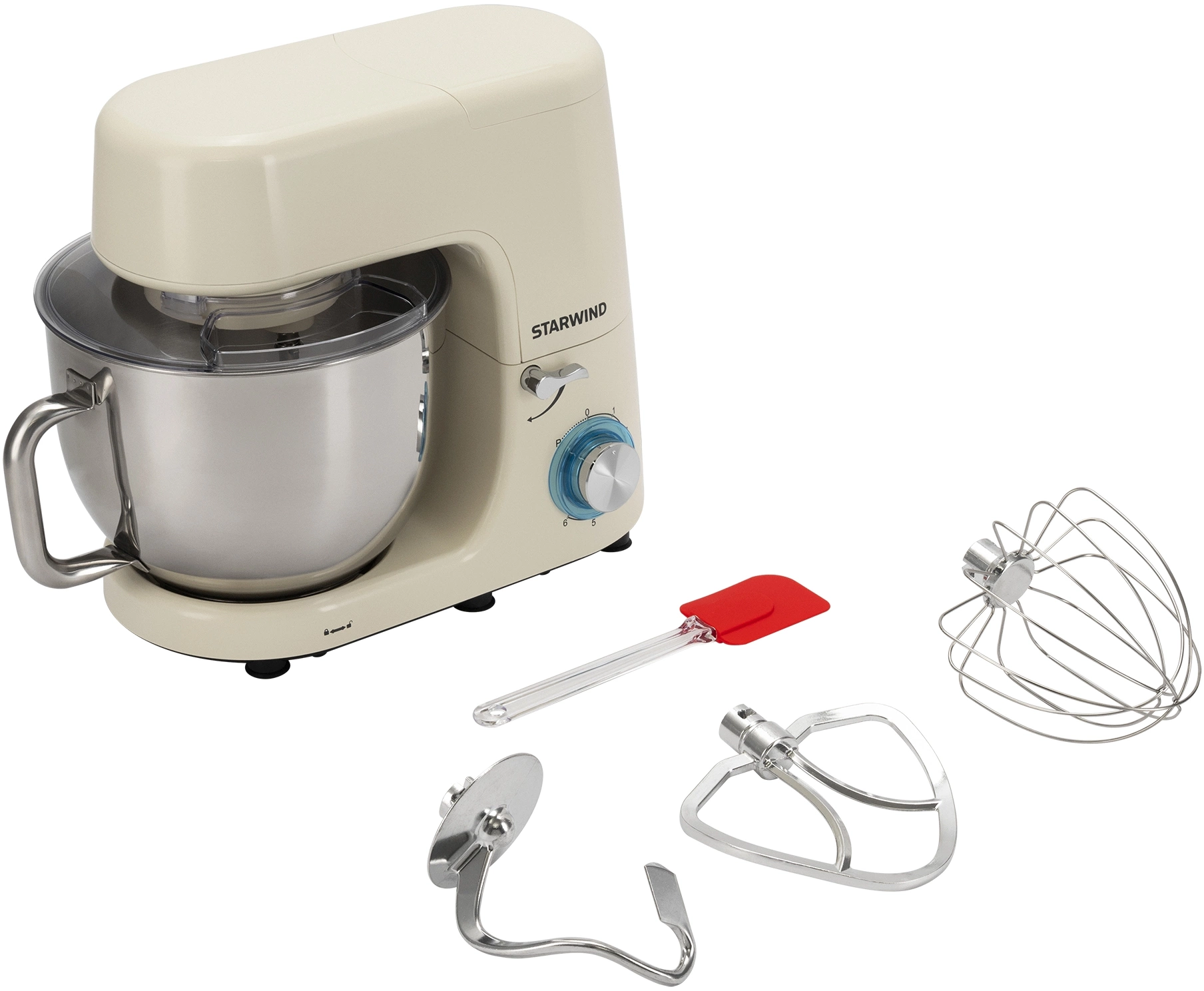 Кухонная машина; чаша; защитная крышка; насадка-венчик; насадка-лопатка; насадка-крюк; инструкция с гарантийным талоном; книга рецептов; силиконовая кухонная лопатка