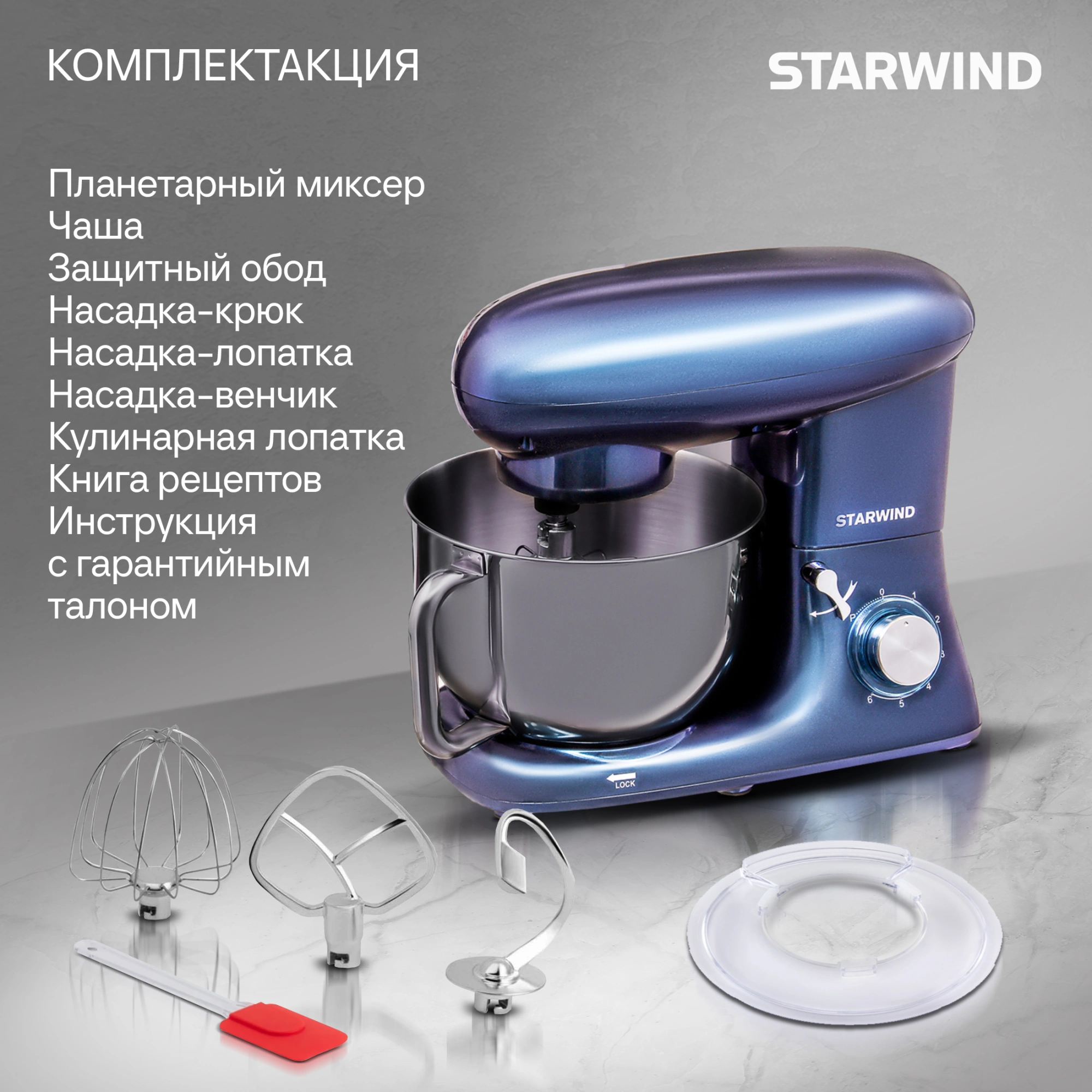 Цельнометаллические насадки: Миксер комплектуется тремя самыми популярными насадками — венчиком для взбивания, лопаткой для мягких смесей и крюком для теста, выполненными из цельного металла, что гарантирует их долгую службу. В комплекте также идут защитная крышка с окном для добавления ингредиентов и кулинарная лопатка, которая позволит легко собрать крем или тесто со стенок чаши.