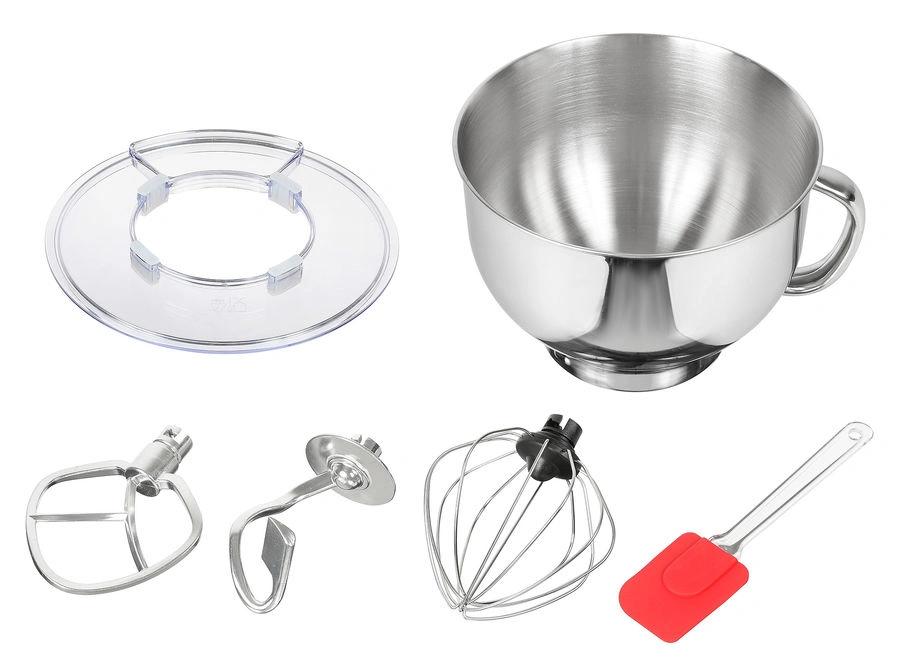 Цельнометаллические насадки: Миксер комплектуется тремя самыми популярными насадками — венчиком для взбивания, лопаткой для мягких смесей и крюком для теста, выполненными из цельного металла, что гарантирует их долгую службу. В комплекте также идут защитная крышка с окном для добавления ингредиентов и кулинарная лопатка, которая позволит легко собрать крем или тесто со стенок чаши.