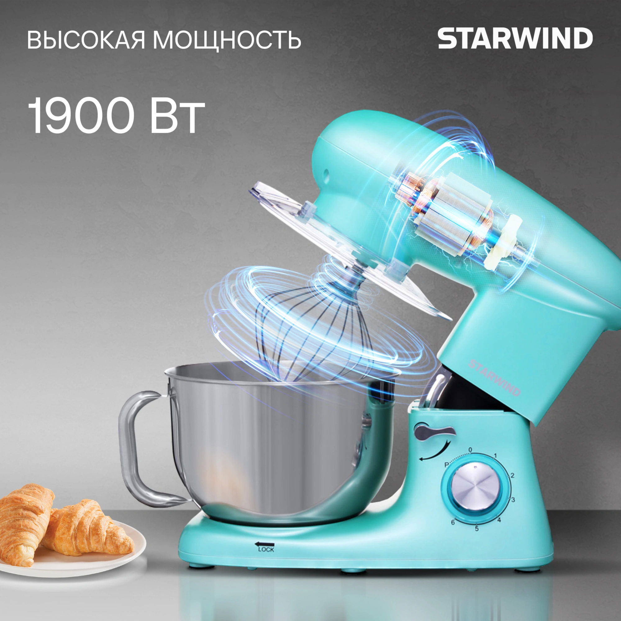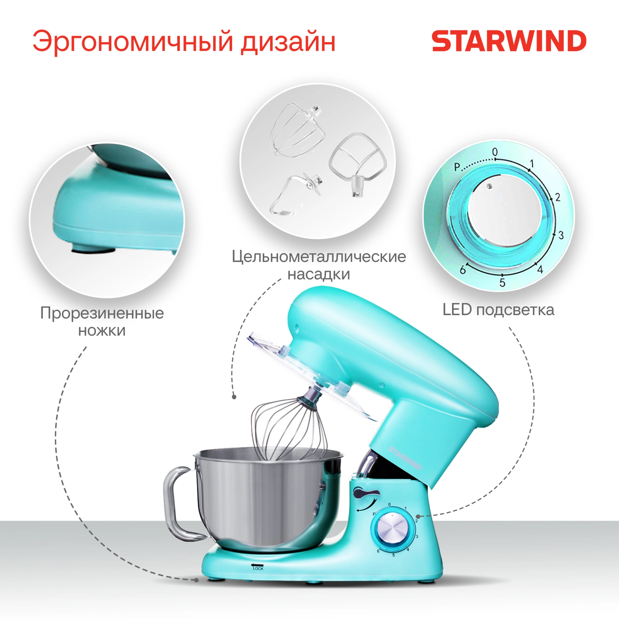 Планетарный миксер Starwind SPM7169 в бирюзовом цвете — это яркий и освежающий акцент на вашей кухне. Его цвет привносит легкость и свежесть, делая приготовление пищи еще более приятным процессом.