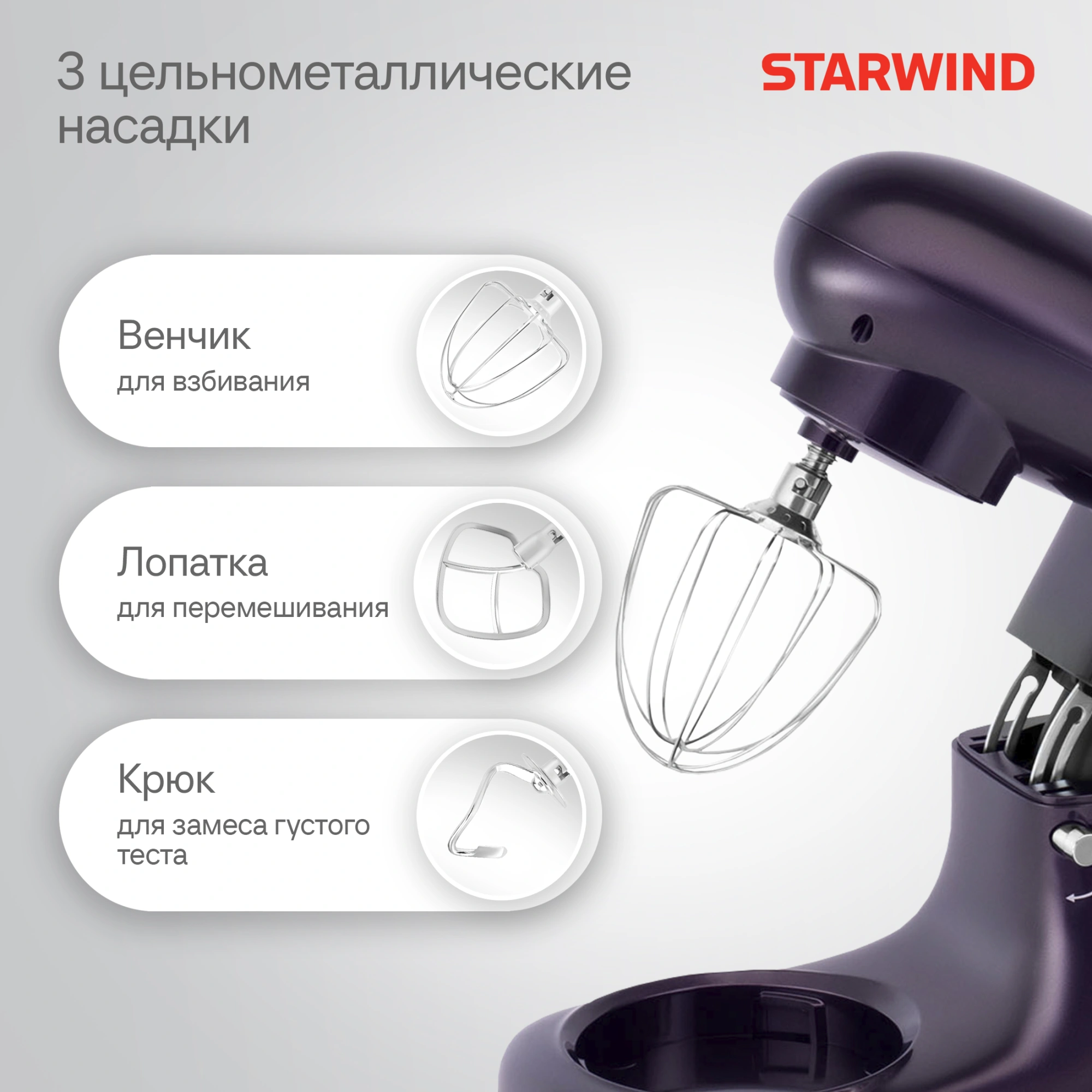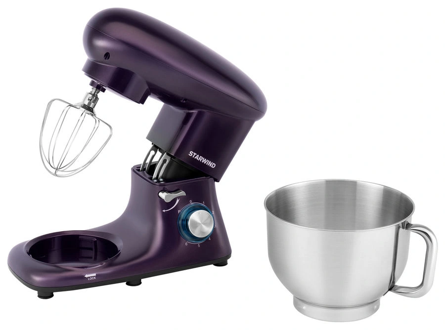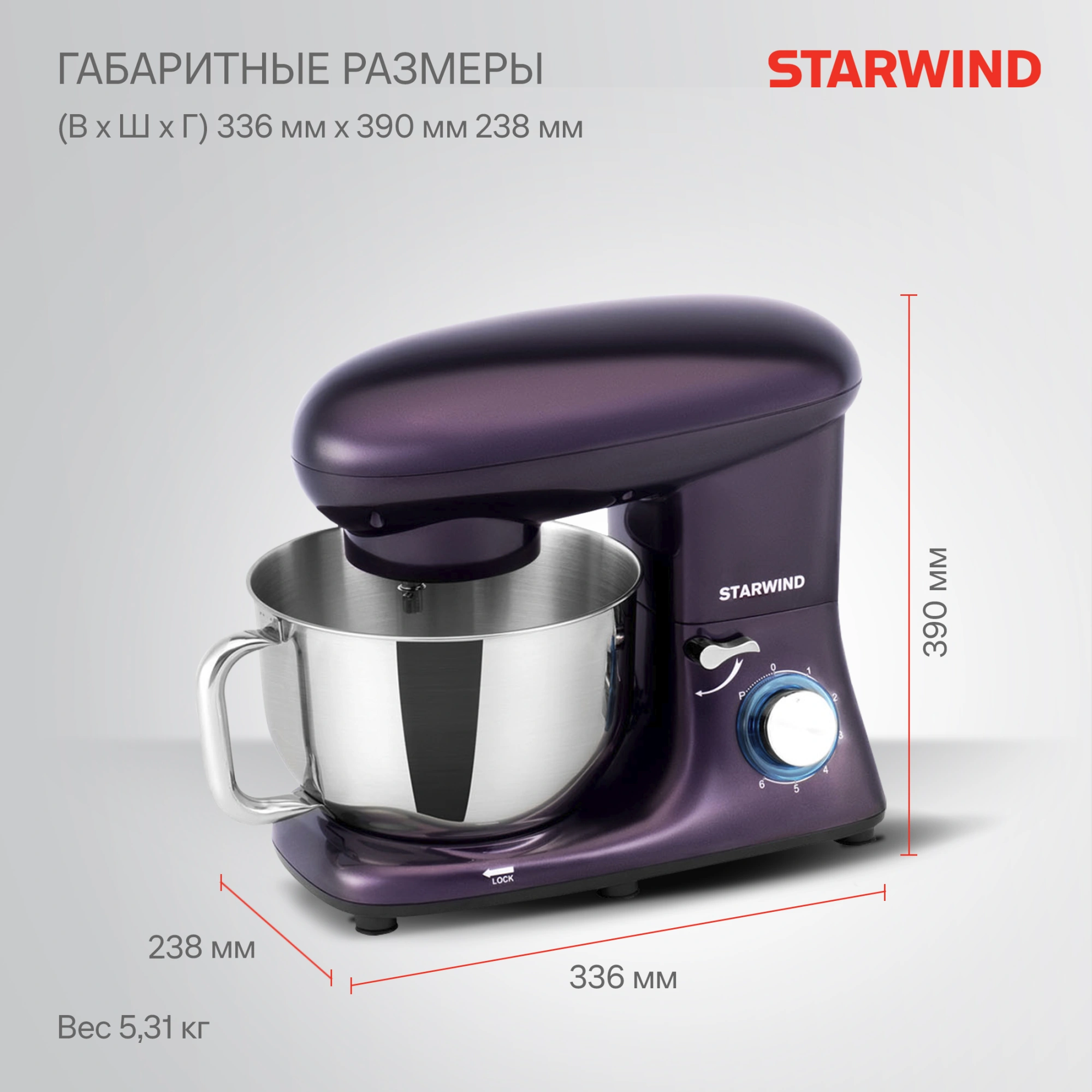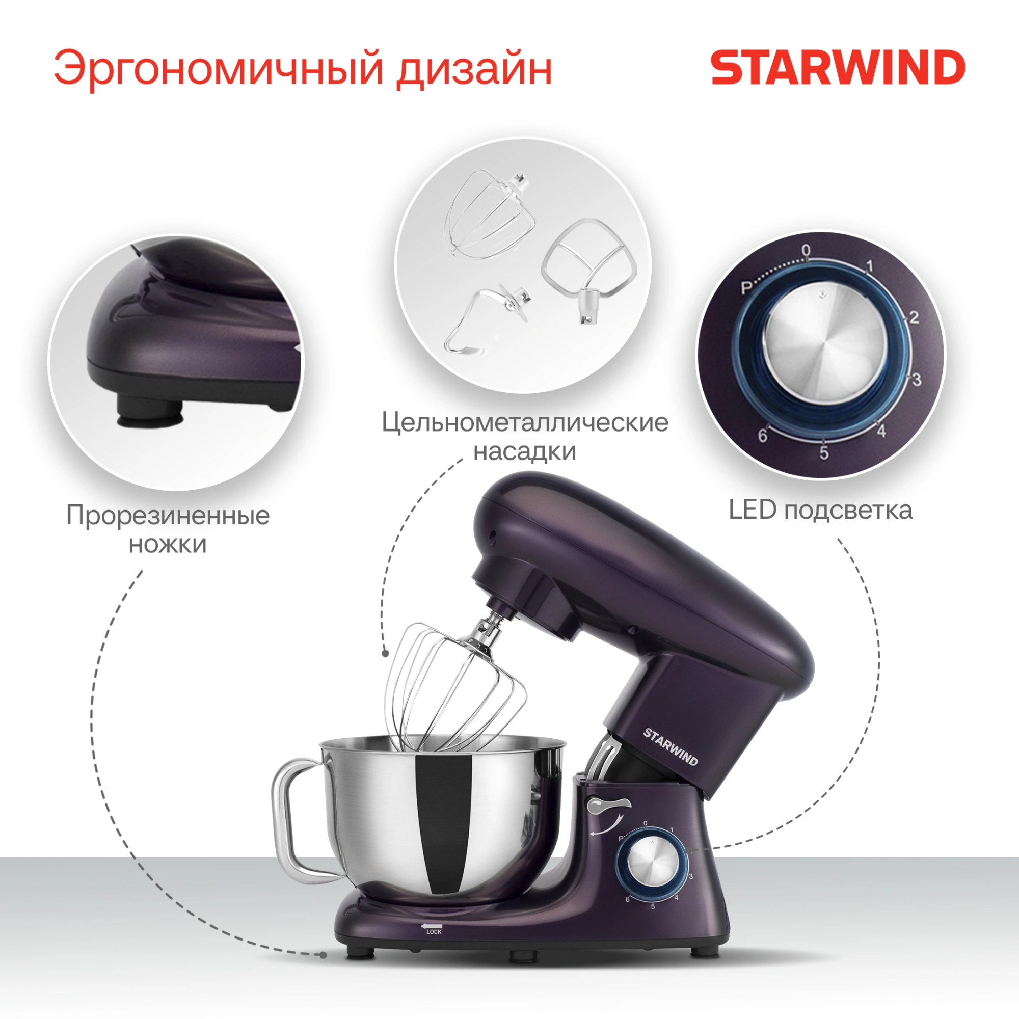 Планетарный миксер Starwind SPM7168 в оттенке ежевики — это стильный прибор с насыщенным темно-фиолетовым цветом, который привнесет роскошь и оригинальность в интерьер вашей кухни.