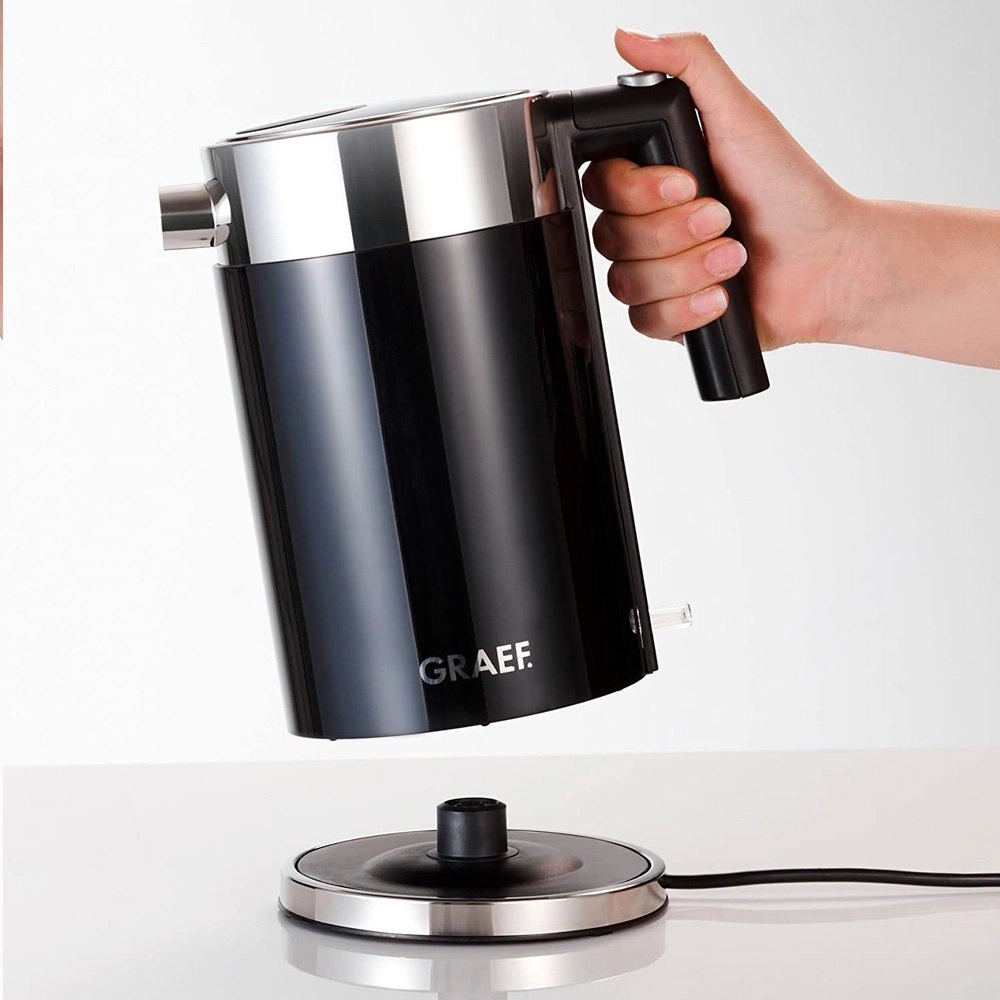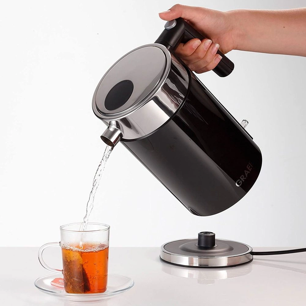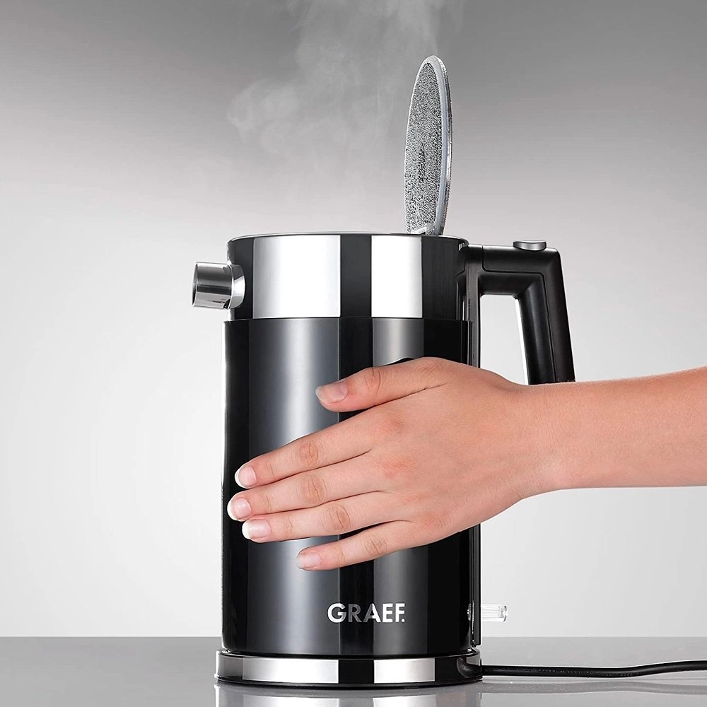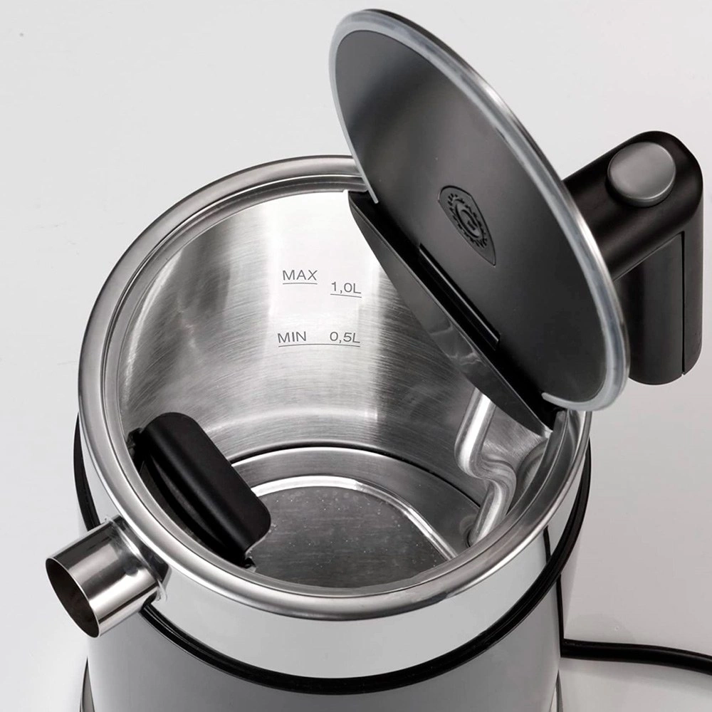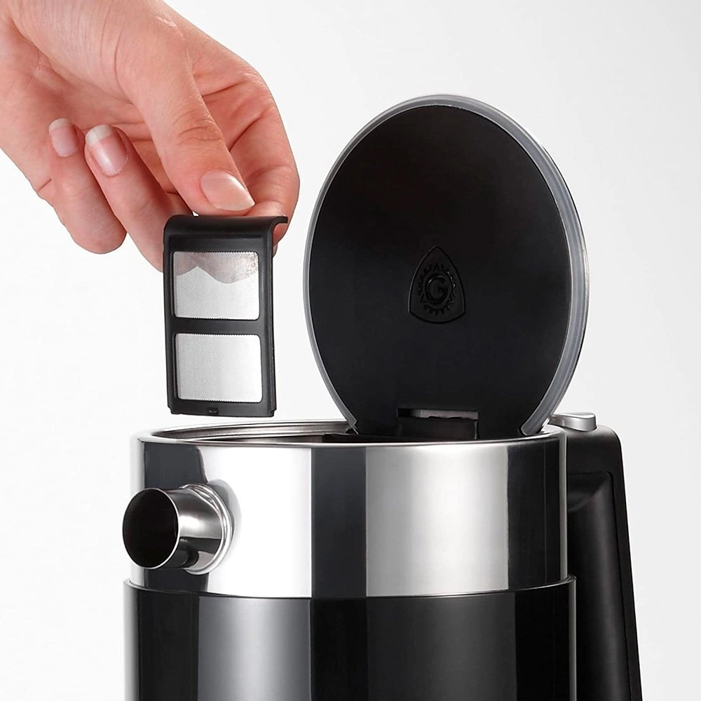 двойные стенки, кнопка открытия крышки, отсек для шнура, подставка 360, фильтр от накипи