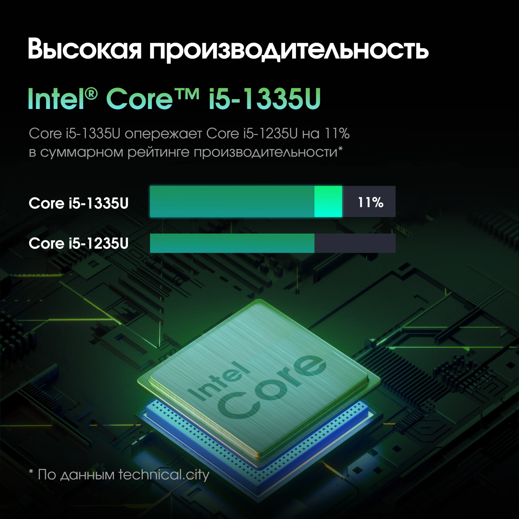 Моноблок работает на базе 10-ядерного процессора Intel Core i5 1335U с 8 энергоэффективными ядрами, который способен обрабатывать до 12 потоков одновременно. Вместе с встроенной видеокартой Intel Iris Xe он гарантирует быструю обработку данных и молниеносное выполнение сложных задач.