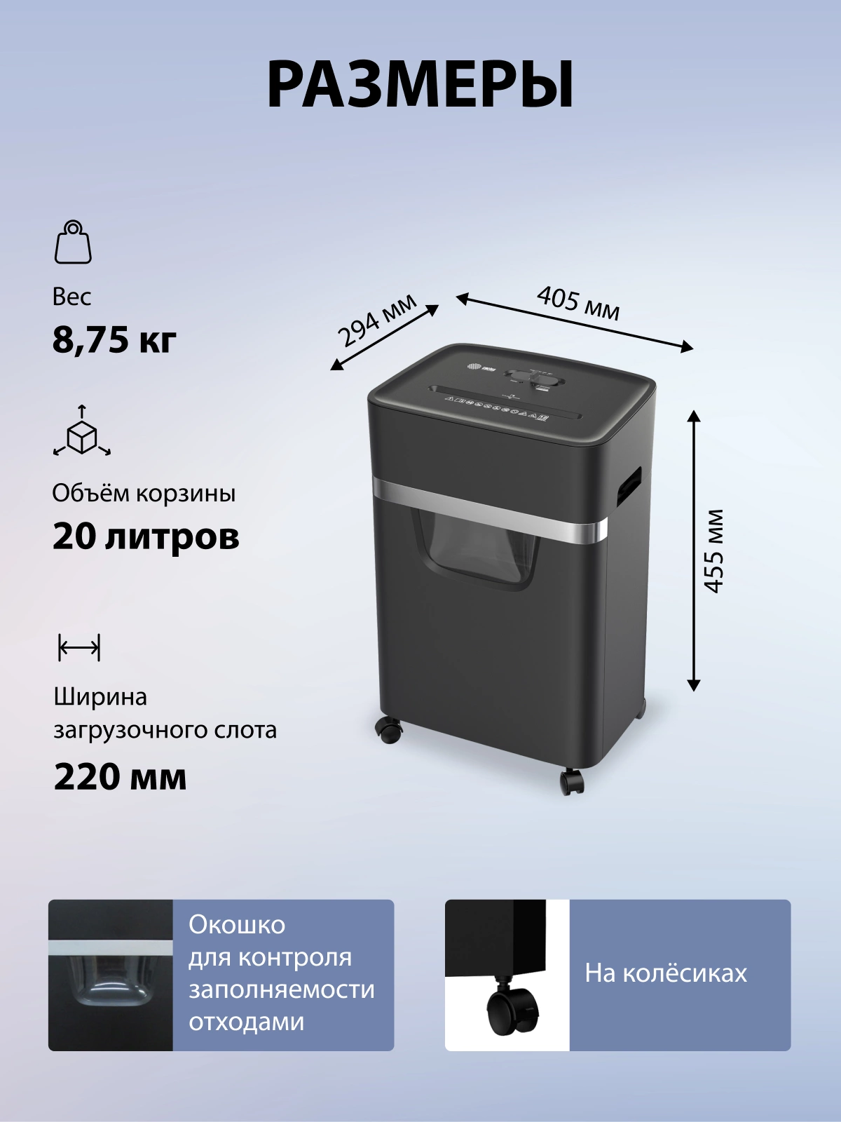 Размеры шредера: 405х294х455 мм