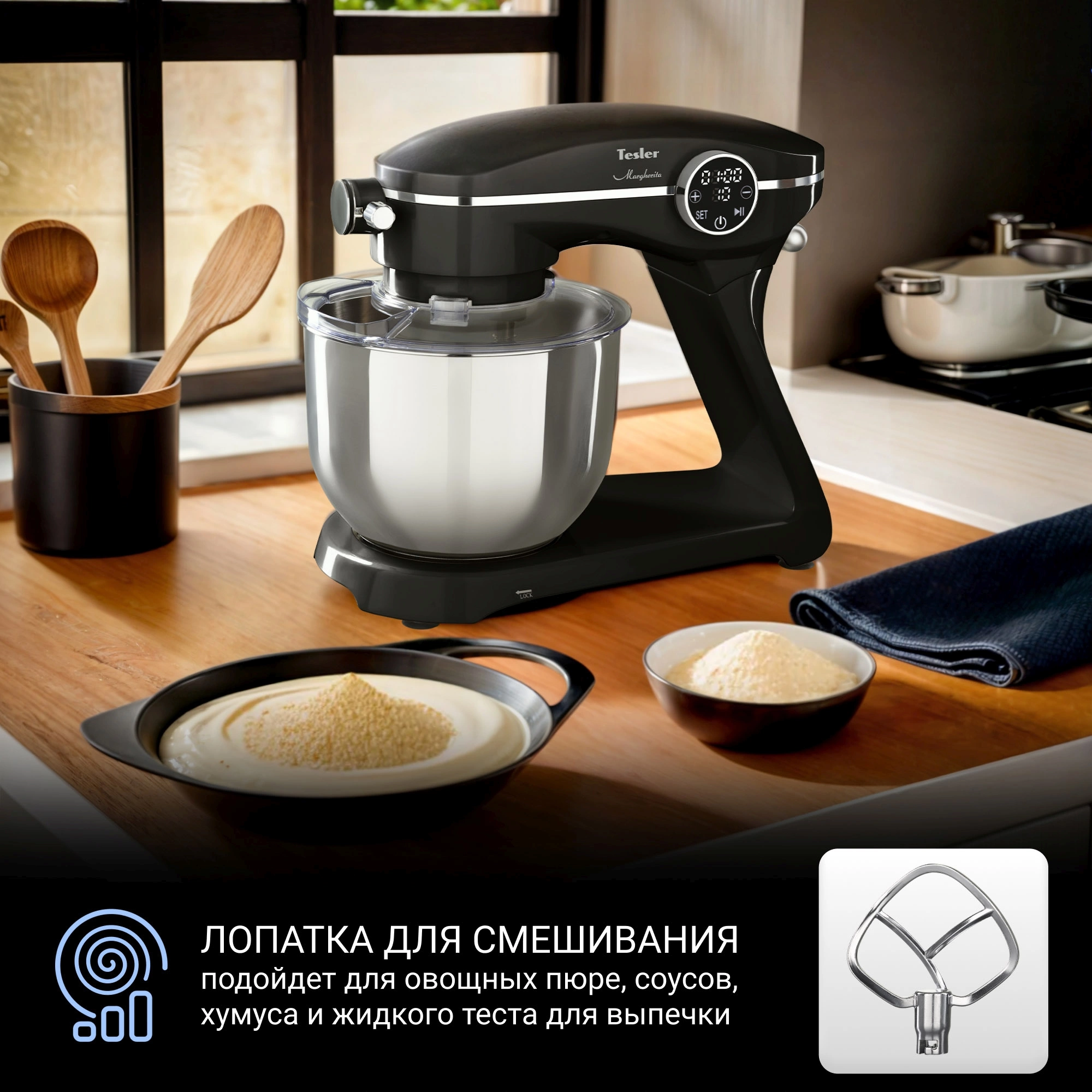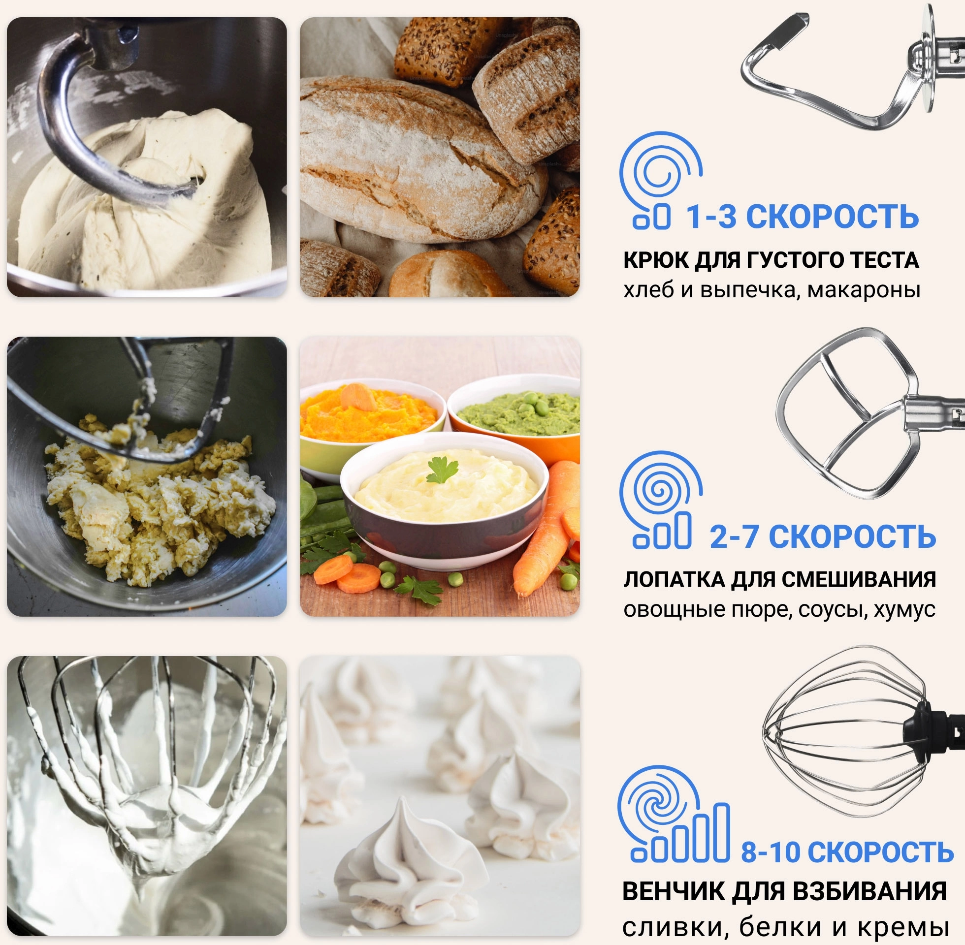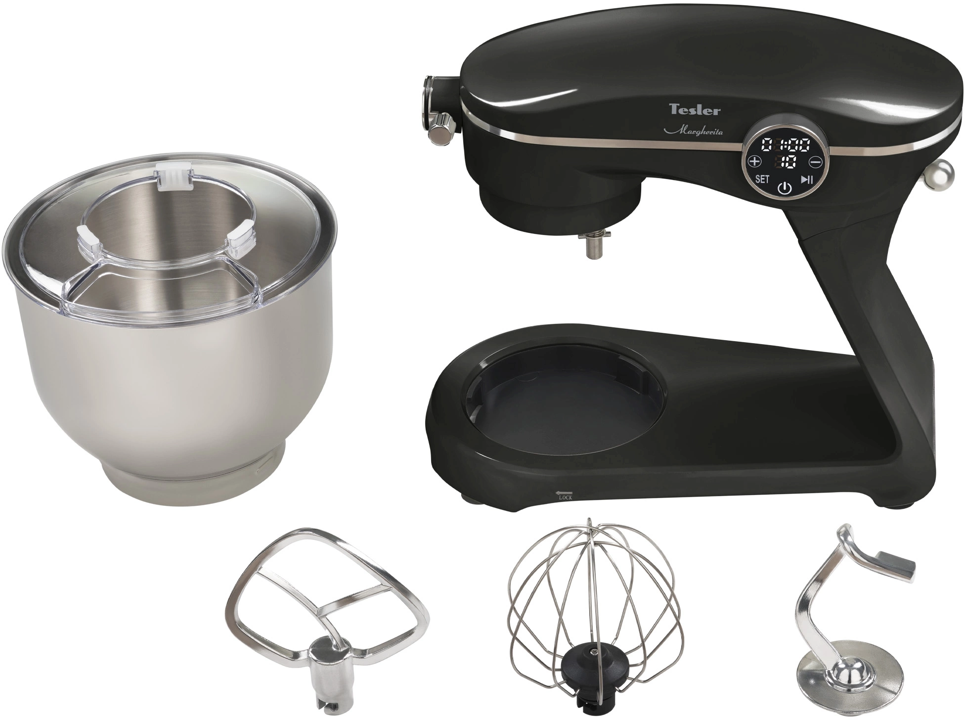 Кухонная машина, чаша из нержавеющей стали, крышка чаши, крюк для замеса теста, венчик для взбивания, лопатка для перемешивания, инструкция, гарантийный талон
