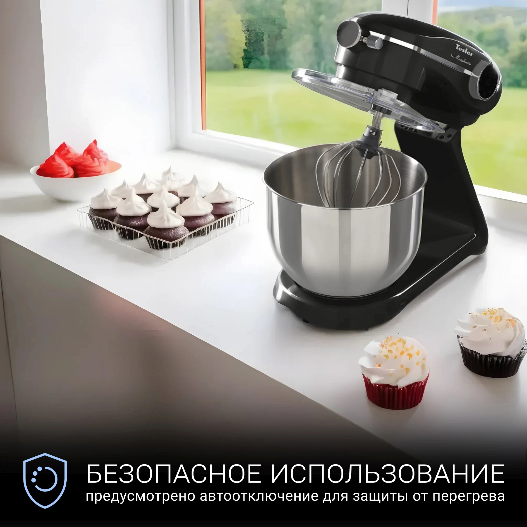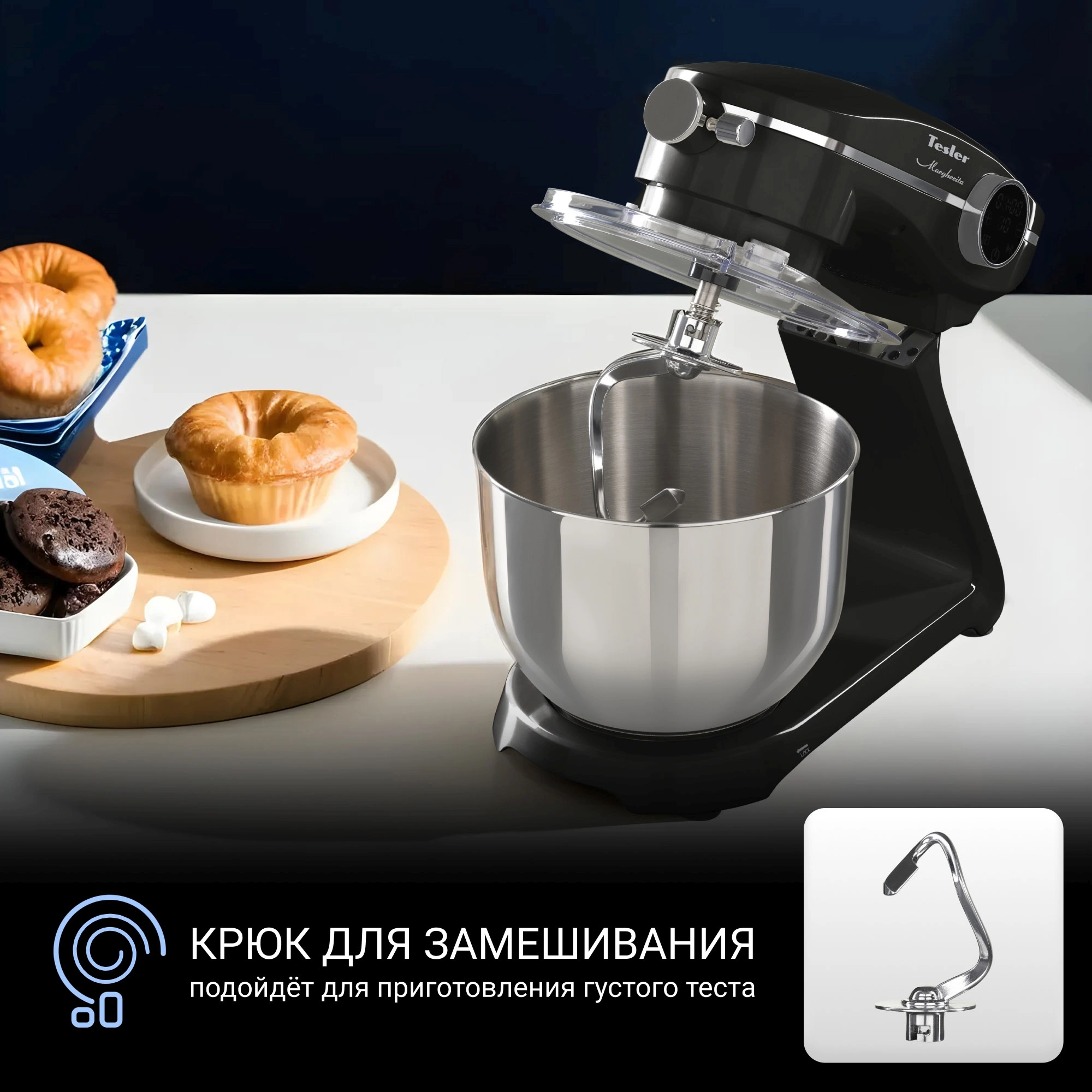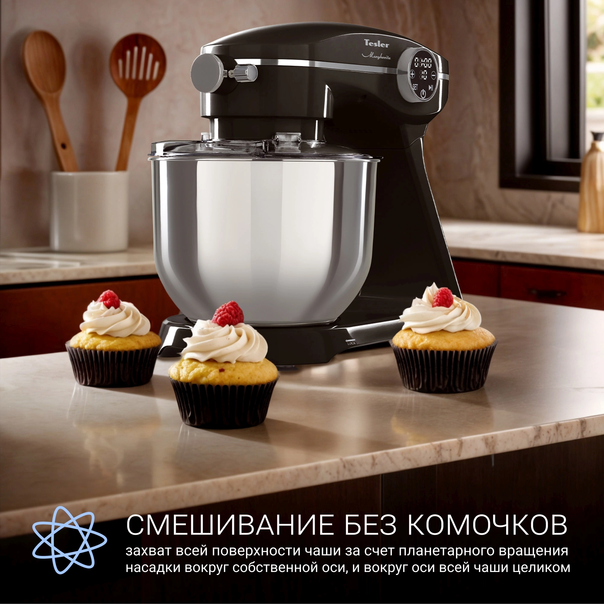 Кухонная машина, чаша из нержавеющей стали, крышка чаши, крюк для замеса теста, венчик для взбивания, лопатка для перемешивания, инструкция, гарантийный талон