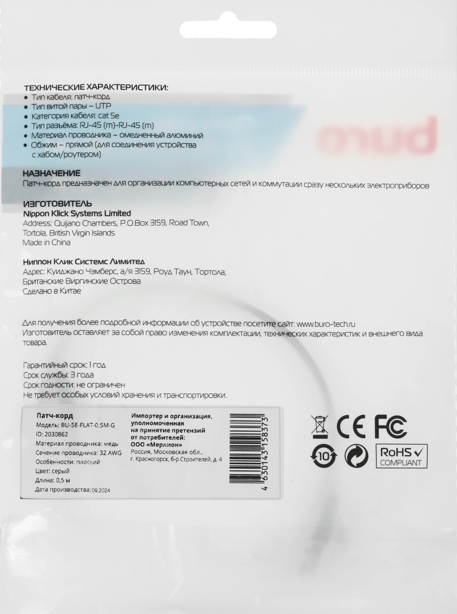 10Гбит/с UTP 4 пары cat.5E Cu molded 0.5м серый RJ...