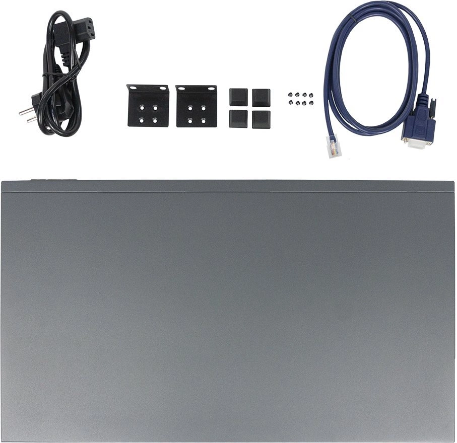 Коммутатор OS3254, кабель питания, консольный кабель с разъемом RJ-45, комплект для установки в 19-дюймовую стойку, краткое руководство по установке.