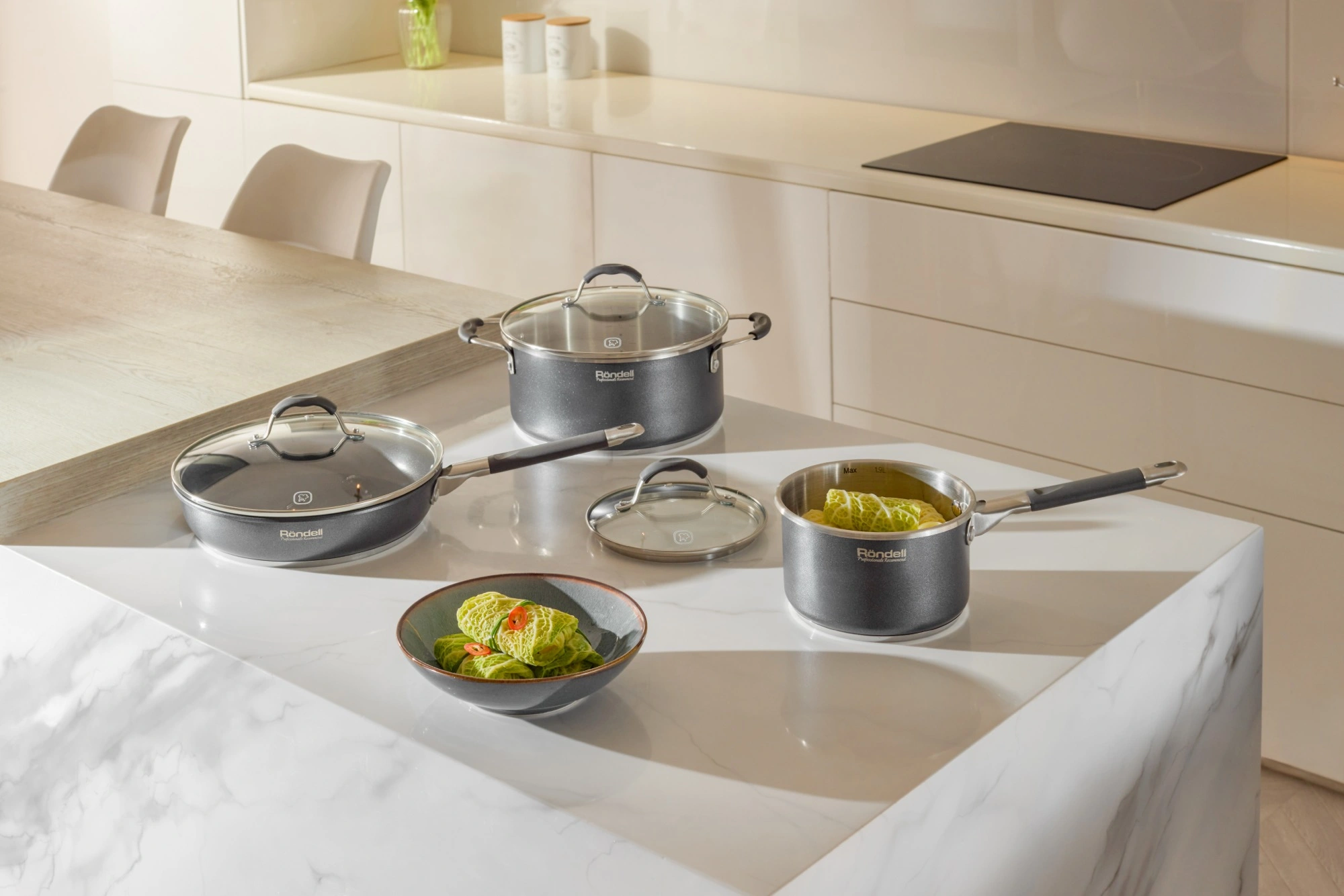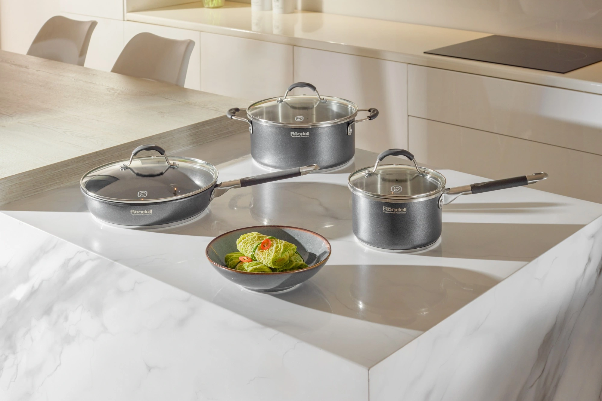 Материал: высококачественная нержавеющая сталь 18/10. Технология: тройное вштампованное, а затем вплавленное дно без воздушных полостей. Материал крышки: термостойкое стекло и нержавеющая сталь. Аксессуары: нержавеющая сталь и силикон.