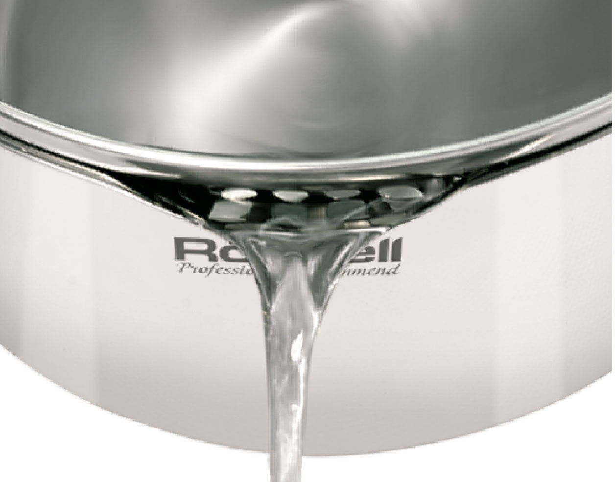 Технология: тройное вштампованное, а затем вплавленное дно без воздушных полостей. Аксессуары: удобные комбинированные: нержавеющая сталь и силикон. Преимущества: комбинированная крышка из термостойкого стекла с ободком из нержавеющей стали для удобного слива жидкости (2 диаметра отверстий).