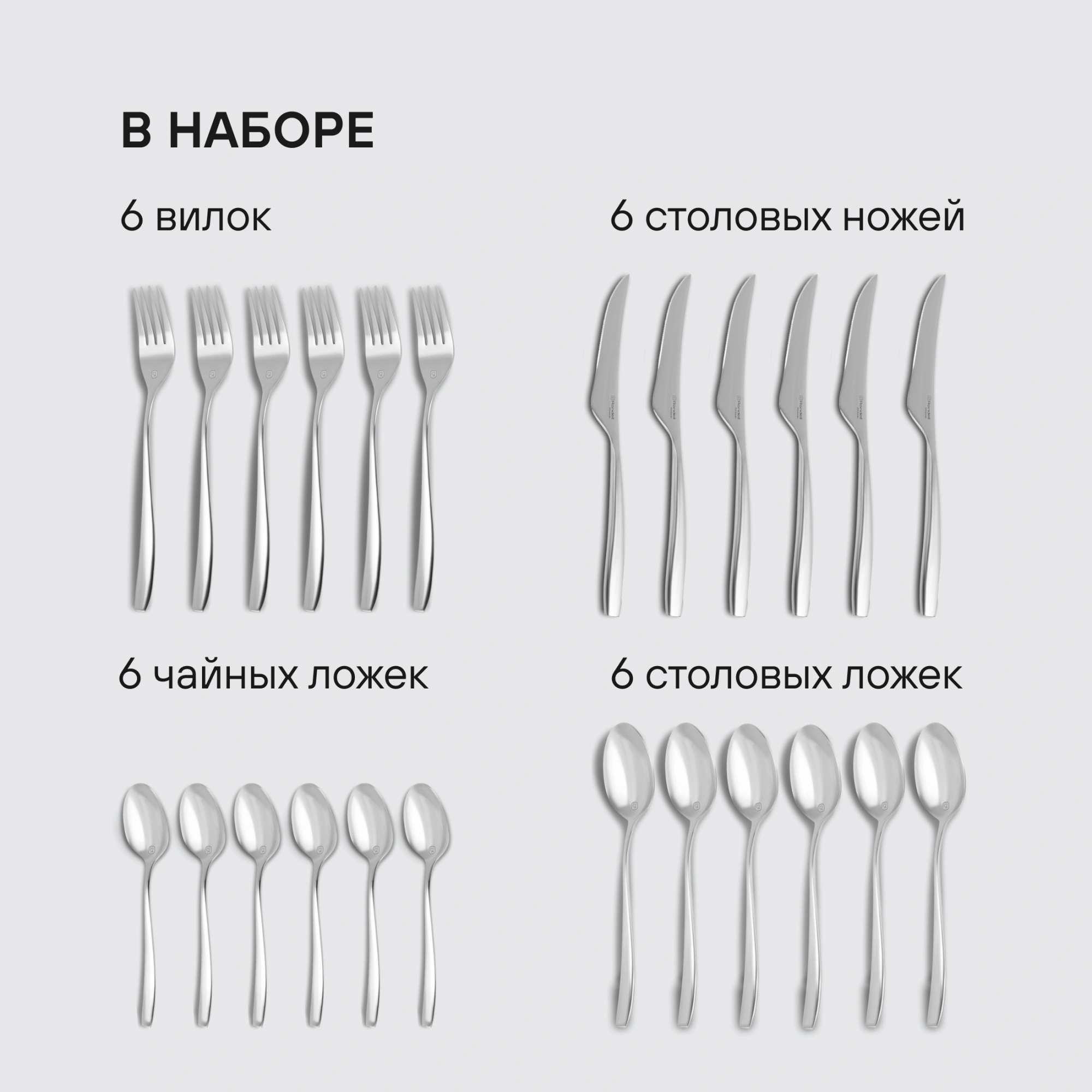 шесть вилок, шесть столовых ложек, шесть ножей и шесть чайных ложек