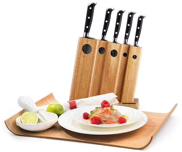 Все рабочие поверхности кухонных ножей изготовлены из высококачественной стали с двусторонней заточкой, что гарантирует им безупречную длительную службу на вашей кухне. Этому способствует и классическое трехклепочное крепление рукояток, выполненных из бакелита и стали.