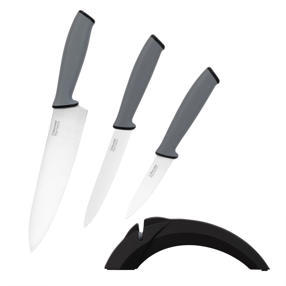 Двусторонняя заточка лезвий. Твердость по шкале Роквелла 52-55 HRC. В наборе: универсальный нож, поварской, нож для овощей, точильный камень. Материал рукоятки: пластик и прорезиненные вставки с антибактериальными свойствами. Не подходит для использования в посудомоечных машинах