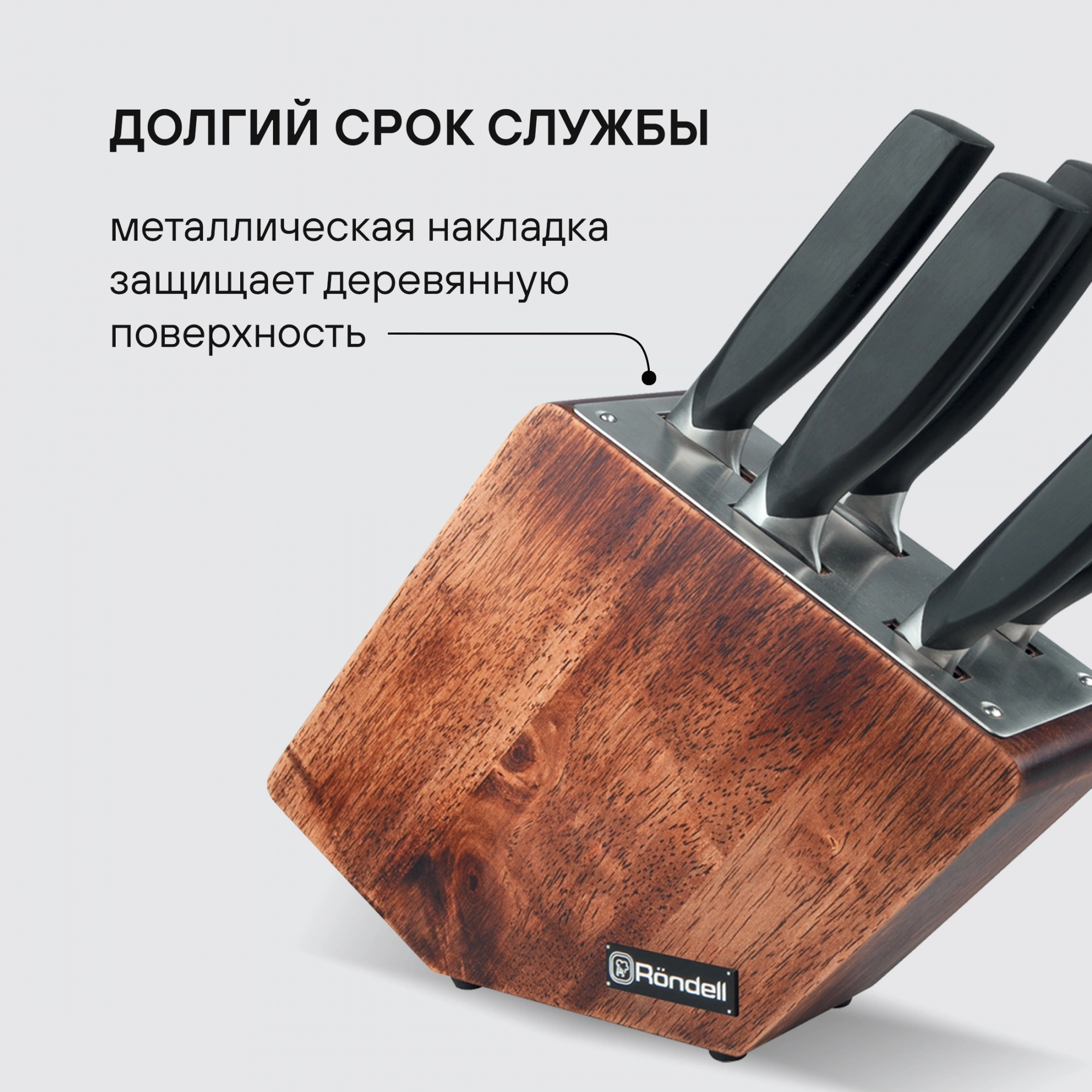 В набор включена стильная деревянная подставка в цвет благородного темного ореха. Для каждого ножа выделено собственное отверстие. А уникальная металлическая накладка на ней не только является элементом декора, но и защищает деревянную поверхность от воздействия лезвий.