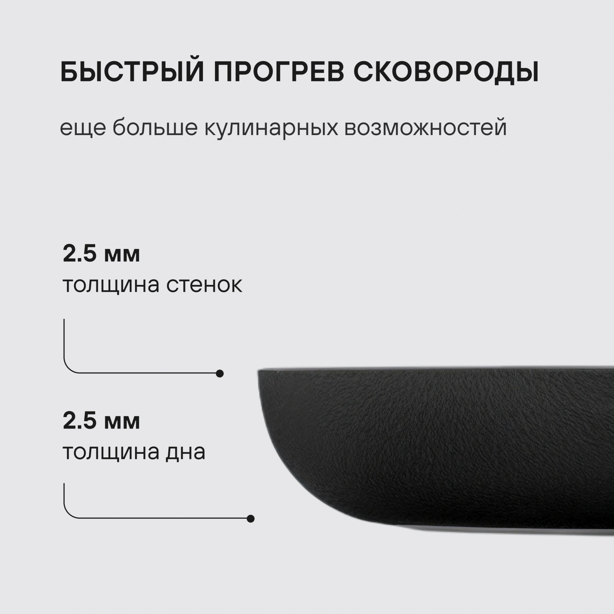 Сковорода Infinity выполнена из штампованного алюминия, который отличается равномерным распределением тепла по поверхности, что незаменимо для быстрого приготовления блюд. При изготовлении ручки использовался силикон и бакелит, который не нагревается во время воздействия высоких температур.
