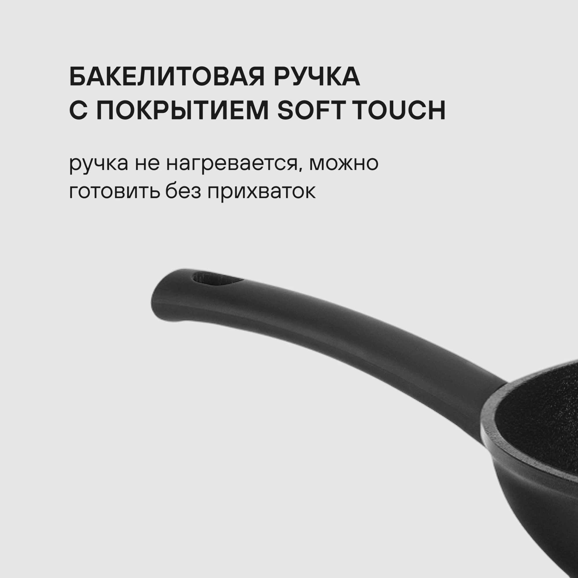 Технология: специальная фактурная обработка внутренней поверхности. Аксессуары: из бакелита с покрытием Soft Touch. Преимущества: рельефная поверхность дна; Равномерное распределение температуры в процессе приготовления блюд; Классическая форма; Высокие стенки корпуса – большой литраж посуды