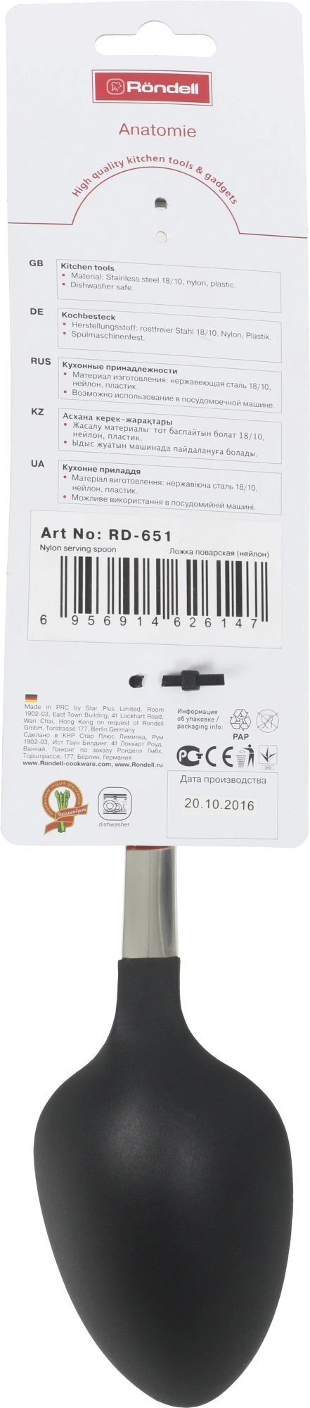 Преимущества: анатомическая форма рукоятки. Использование: подходит для посудомоечной машины. Материал рабочей поверхности: нейлон. Материал ручки: высококачественный пластик/ нержавеющая сталь 18/10. Максимальная температура нагрева: 230 С.