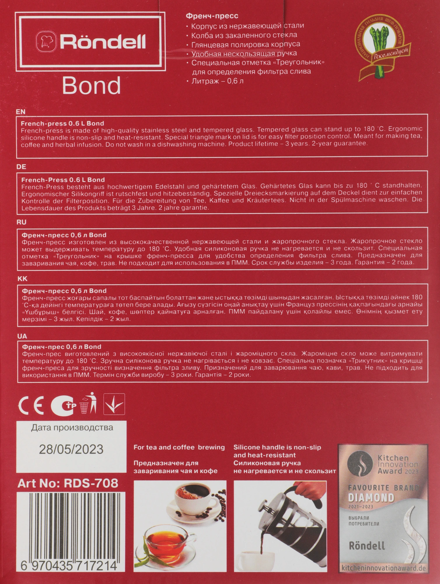 Колба данной модели выполнена из термостойкого стекла, а корпус подставки выполнен в виде необычного переплетения стальных полос. Вы легко приготовите вкуснейшие горячие напитки с добавлением любых пряностей: предохранительный стоппер остановит даже самые маленькие частички чая, трав или кофе.