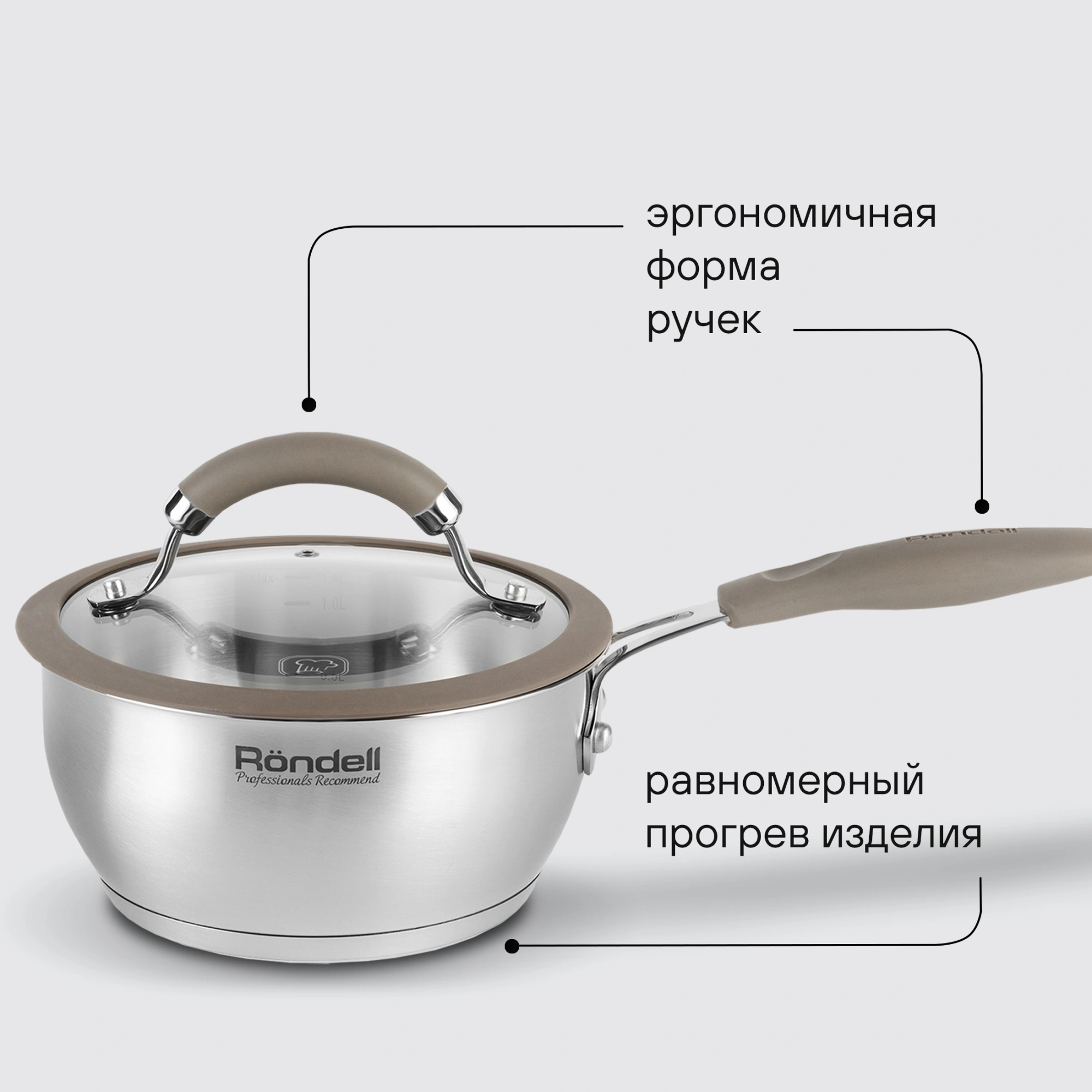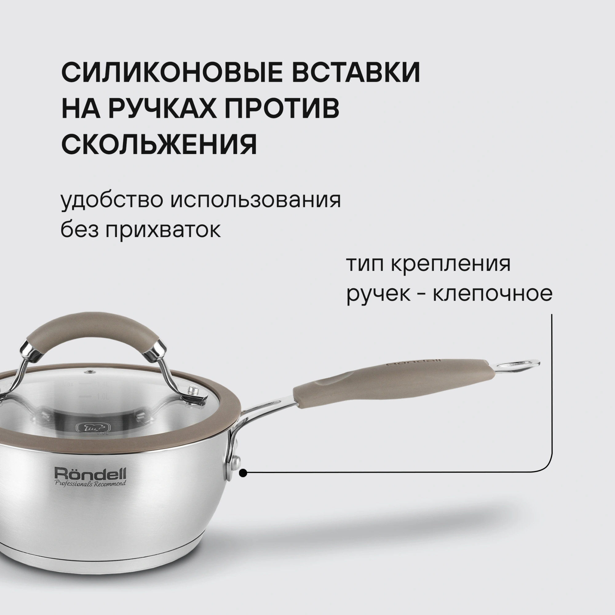 Технология: тройное вштампованное, а затем вплавленное дно без воздушных полостей. Силиконовый обод позволяет крышке закрываться бесшумно, предотвращает сколы при падении. Аксессуары: оригинальная конструкция ручек - комбинация стали и силикона. Преимущества: подходит для всех видов плит.