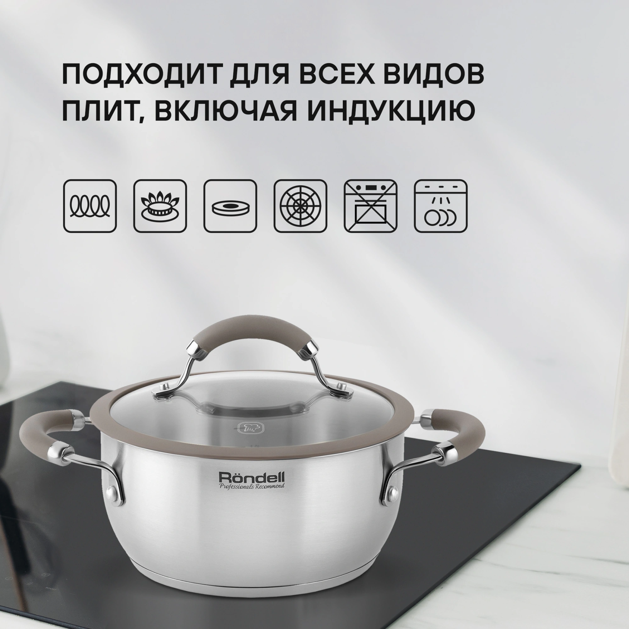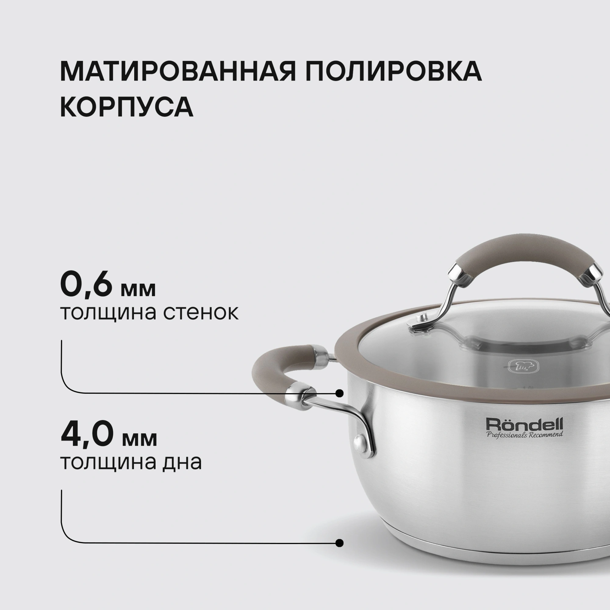 Технология: тройное вштампованное, а затем вплавленное дно без воздушных полостей; Силиконовый обод позволяет крышке закрываться бесшумно, предотвращает сколы при падении. Оригинальная конструкция ручек - комбинация стали и силикона. Преимущества: Ободок крышки из силикона против сколов и трещин