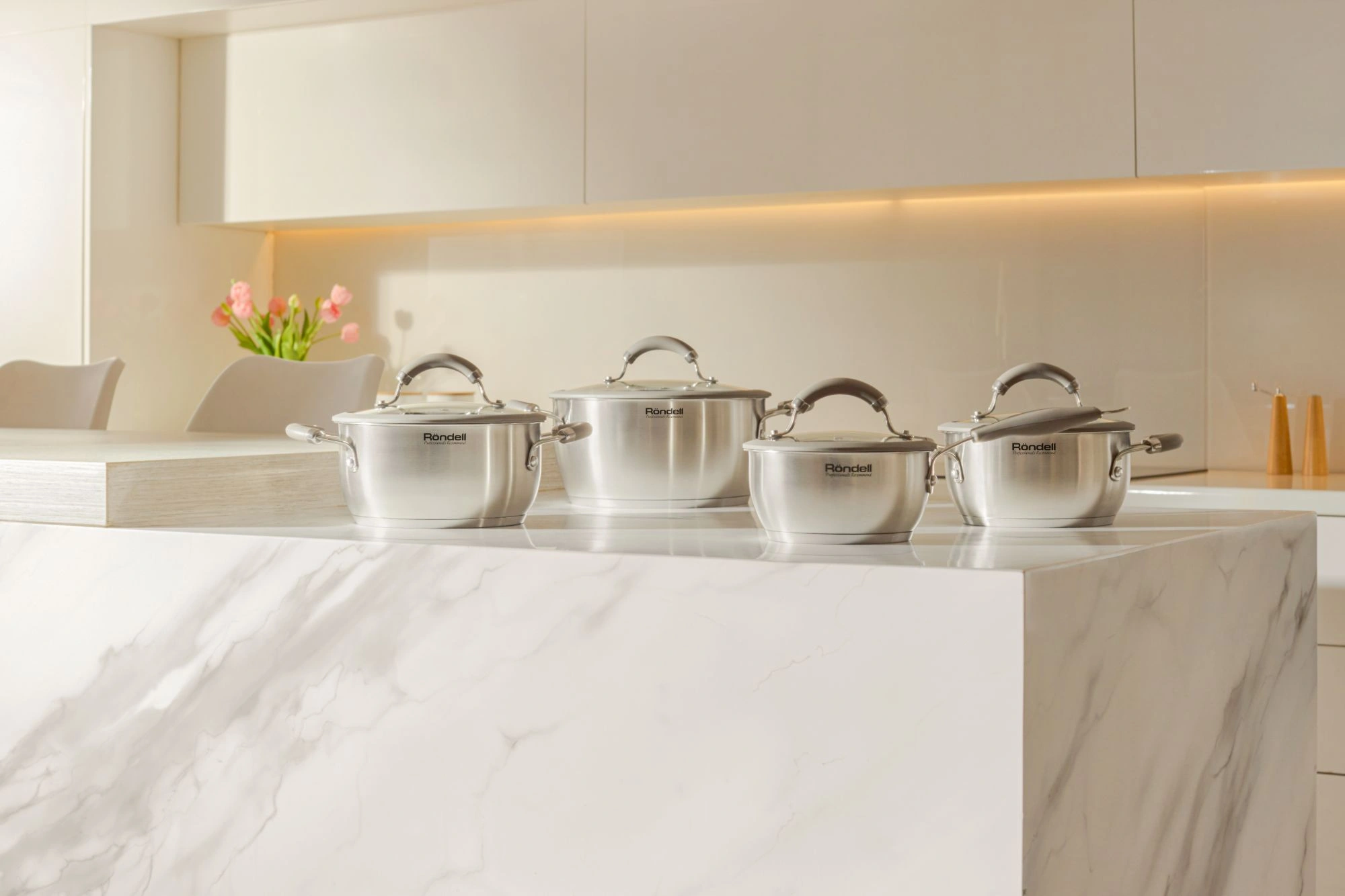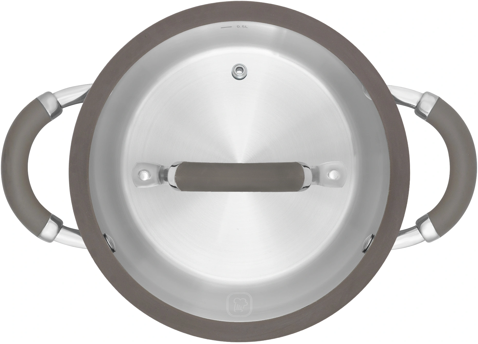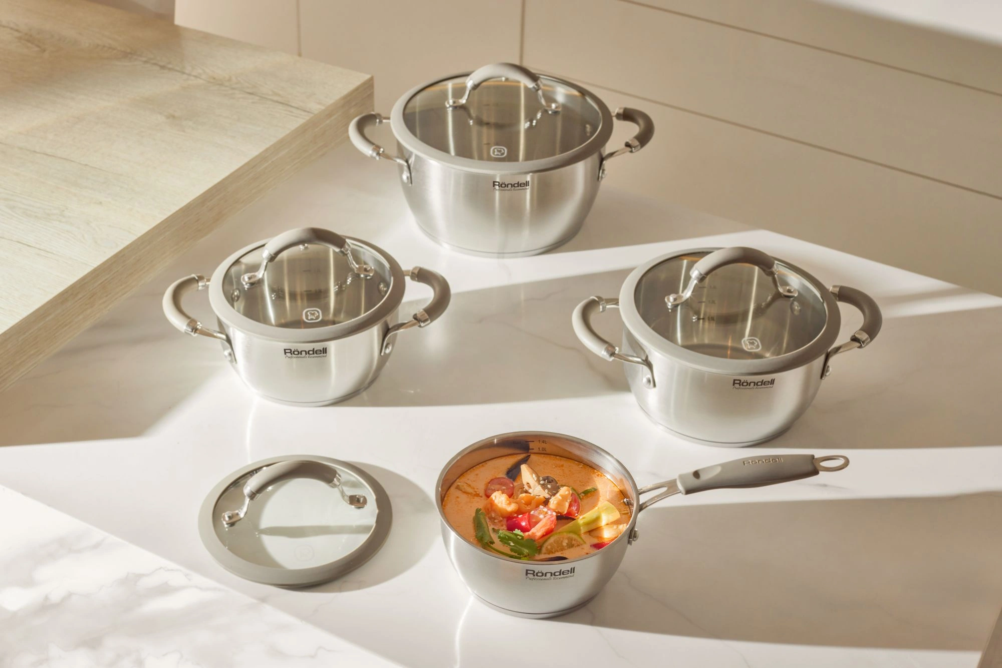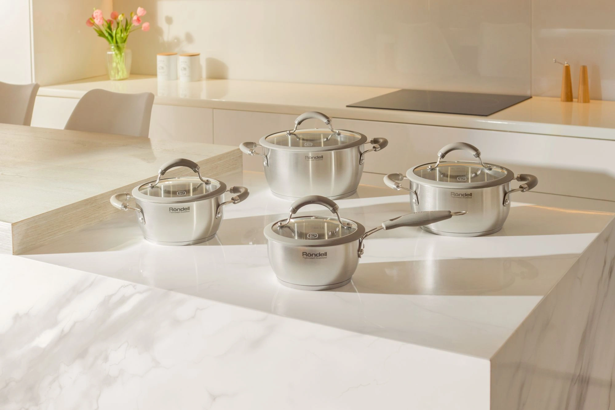 Кастрюли с крышками 18 см (2 л), 20 см (2,8 л), 24 см (5 л), ковш с крышкой 16 см (1,4 л)
