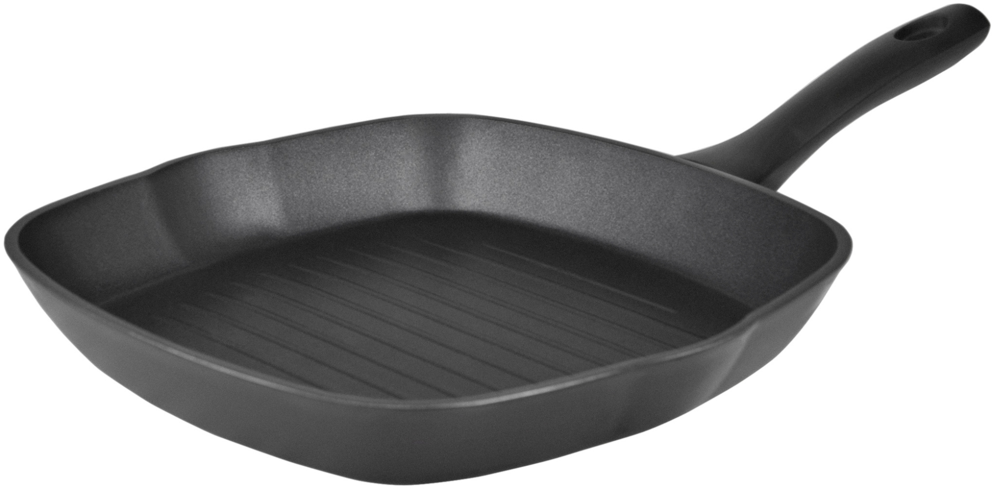 Аксессуары: прочная бакелитовая ручка. Преимущества: ребристое дно для "гриль"-эффекта при жарке; Равномерный прогрев изделия; Равномерная толщина стенок и дна посуды; Классическая форма. Упаковка: картонный рукав.