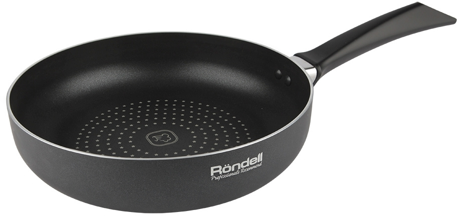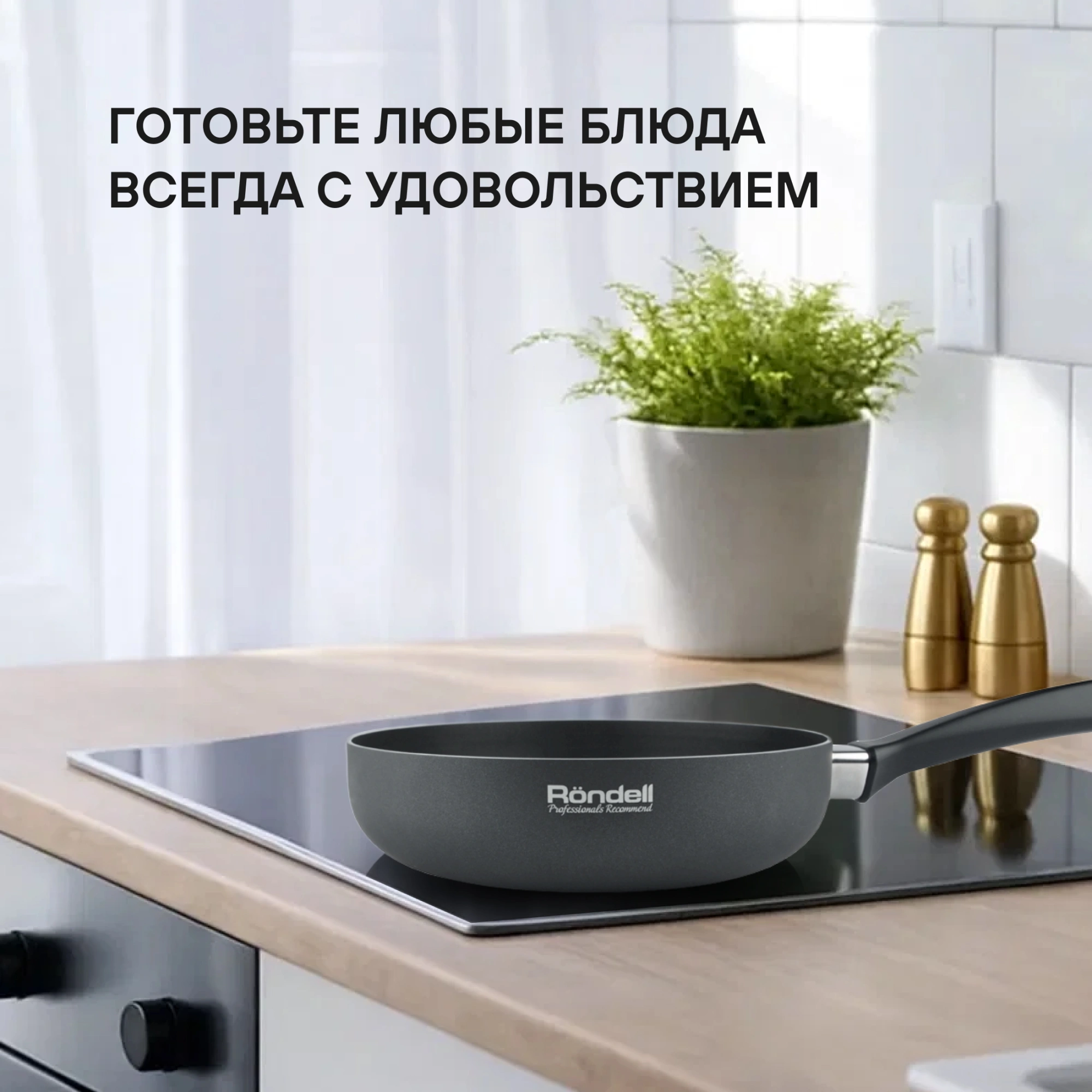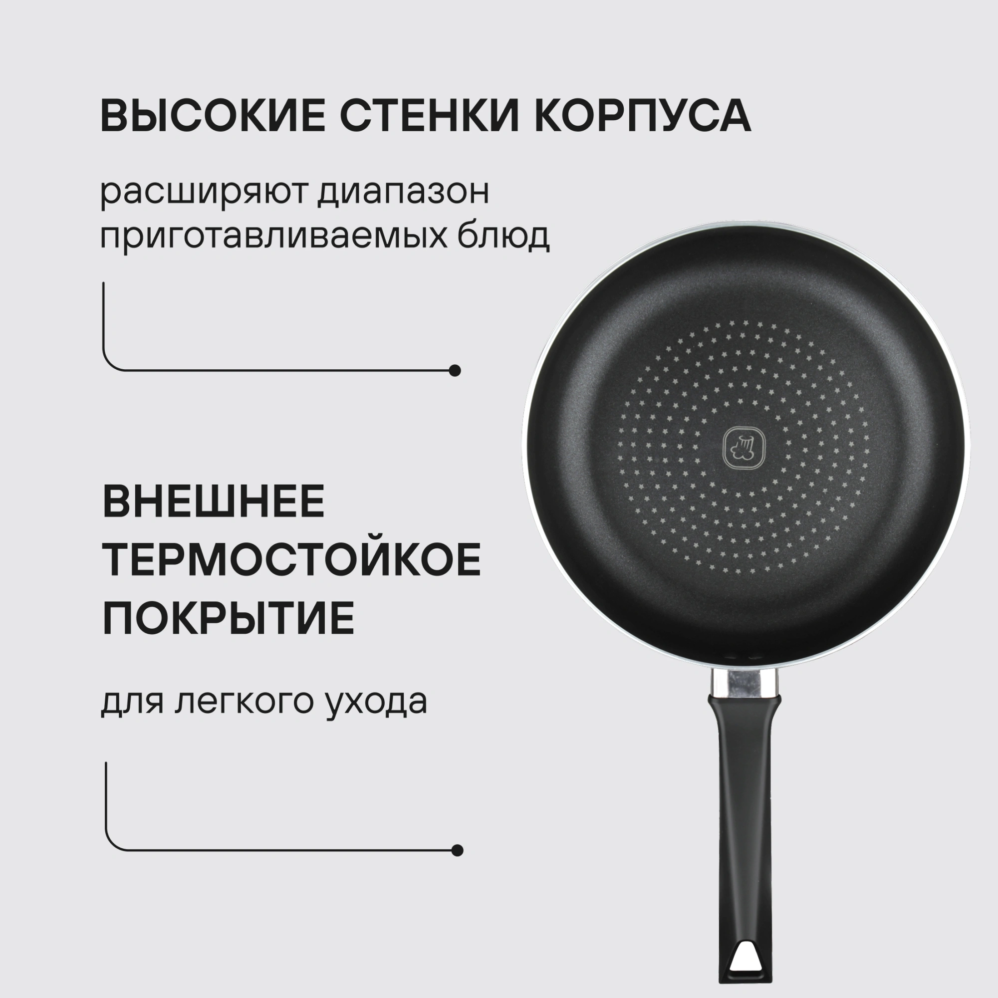 Технология: оригинальный принт на дне сковороды. Аксессуары: из бакелита с покрытием Soft Touch. Преимущества: высокие стенки корпуса – большой литраж посуды; Анатомическая форма рукоятки. Упаковка: картонный рукав.