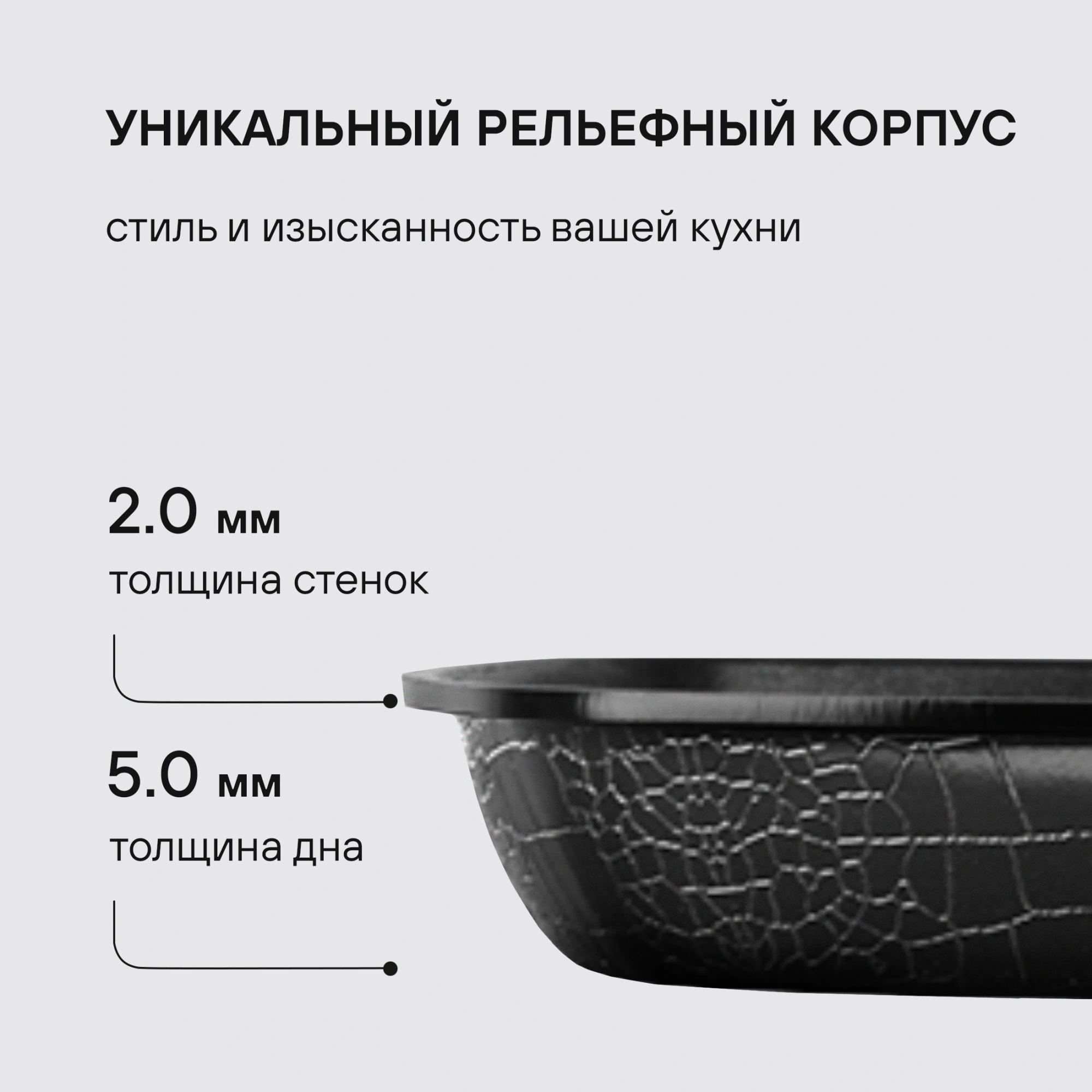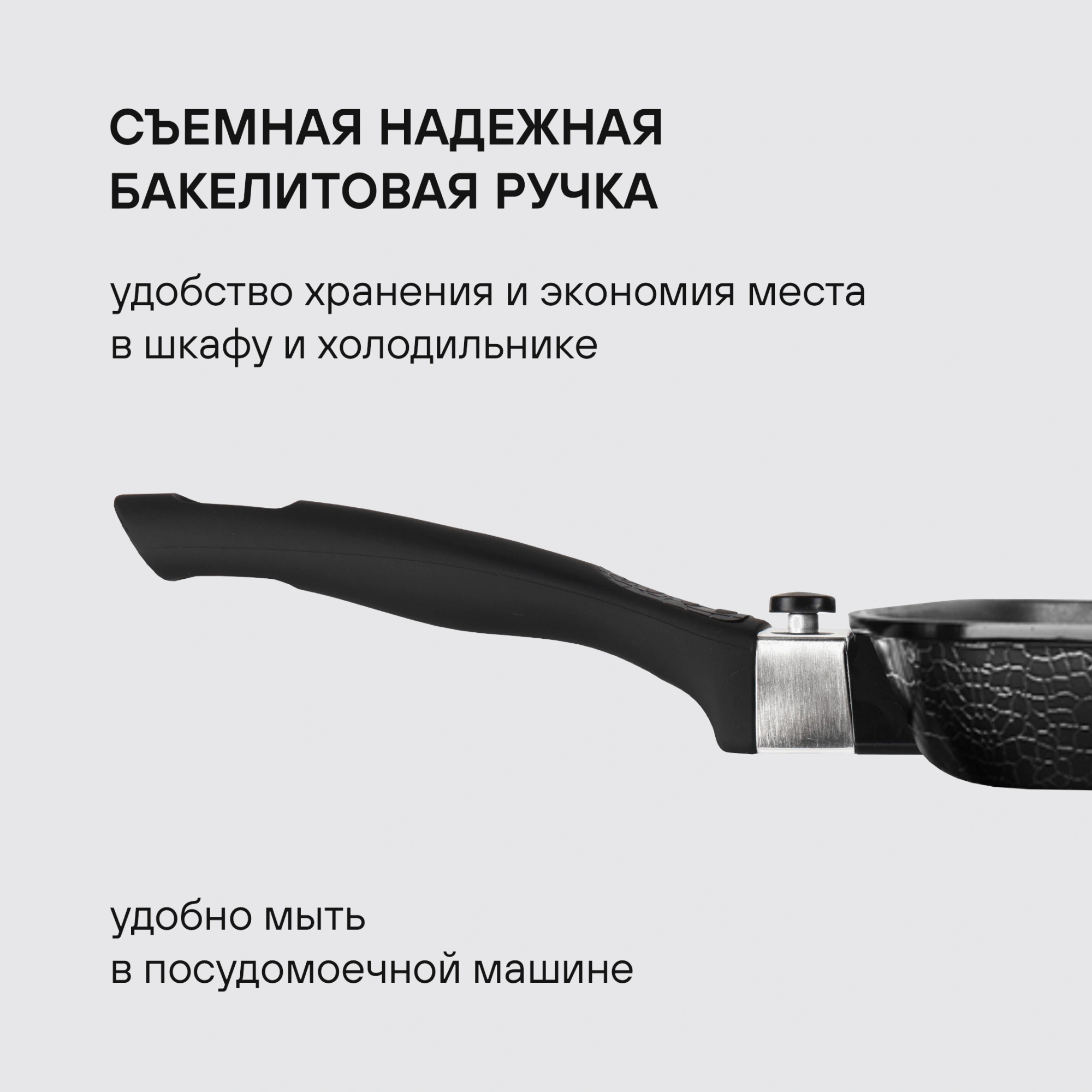Аксессуары: съемная надежная бакелитовая ручка. Преимущества: Цельный индукционный диск; Уникальный внешний декор поверхности сковороды - стилизация под кожу земноводных. Упаковка: подарочная упаковка с отверстиями для аксессуаров.
