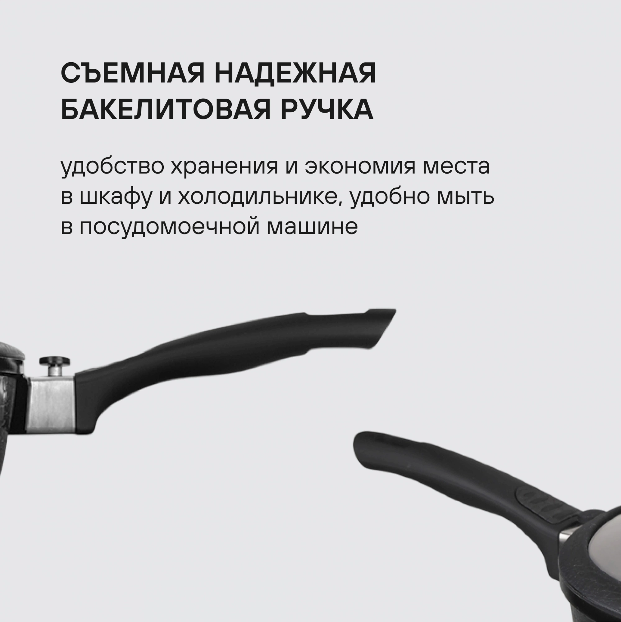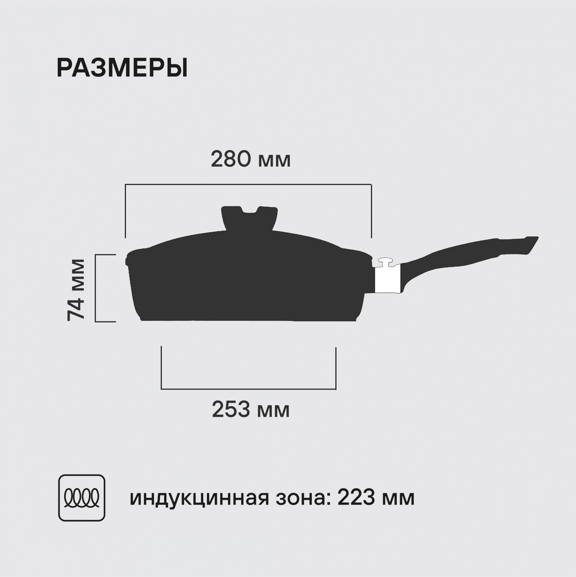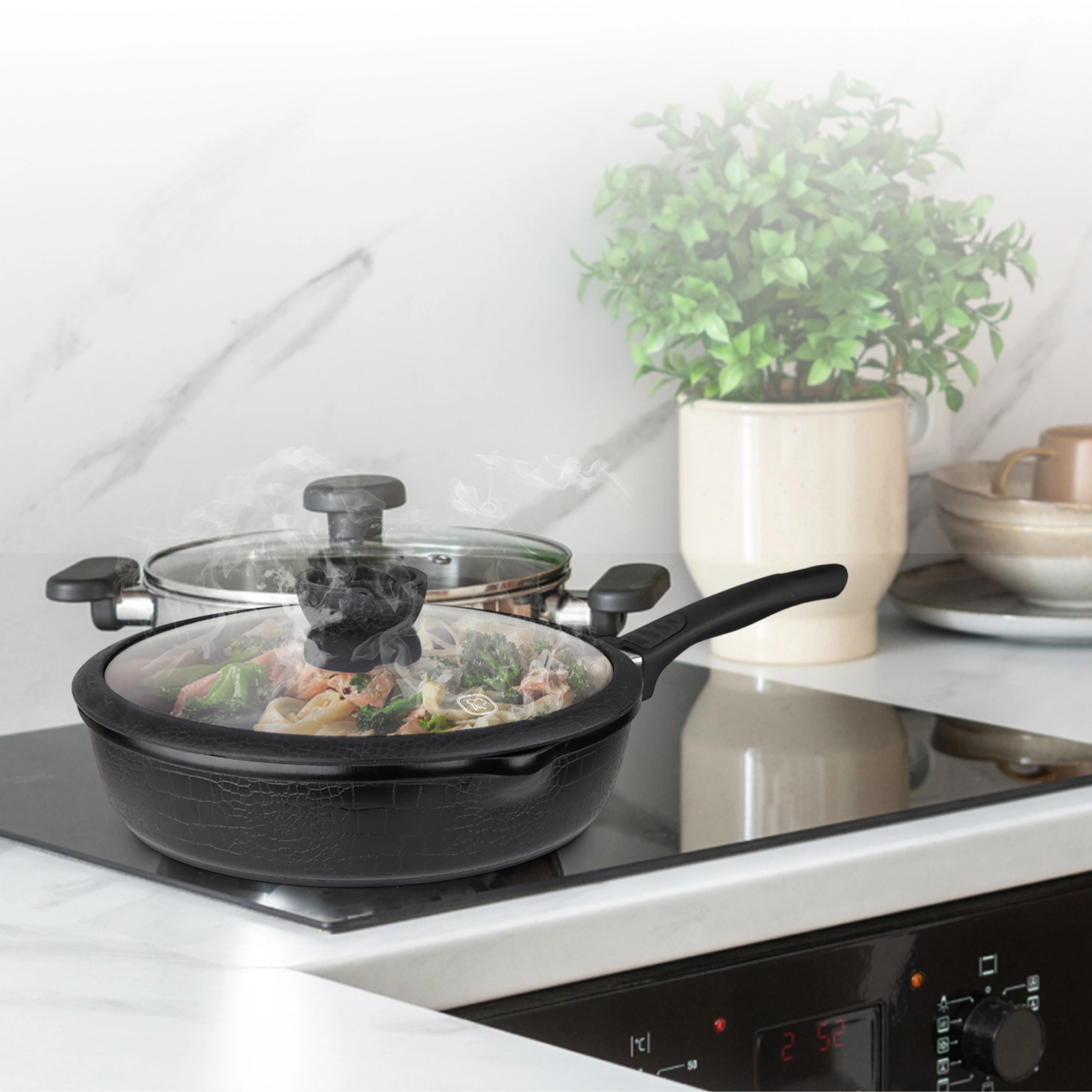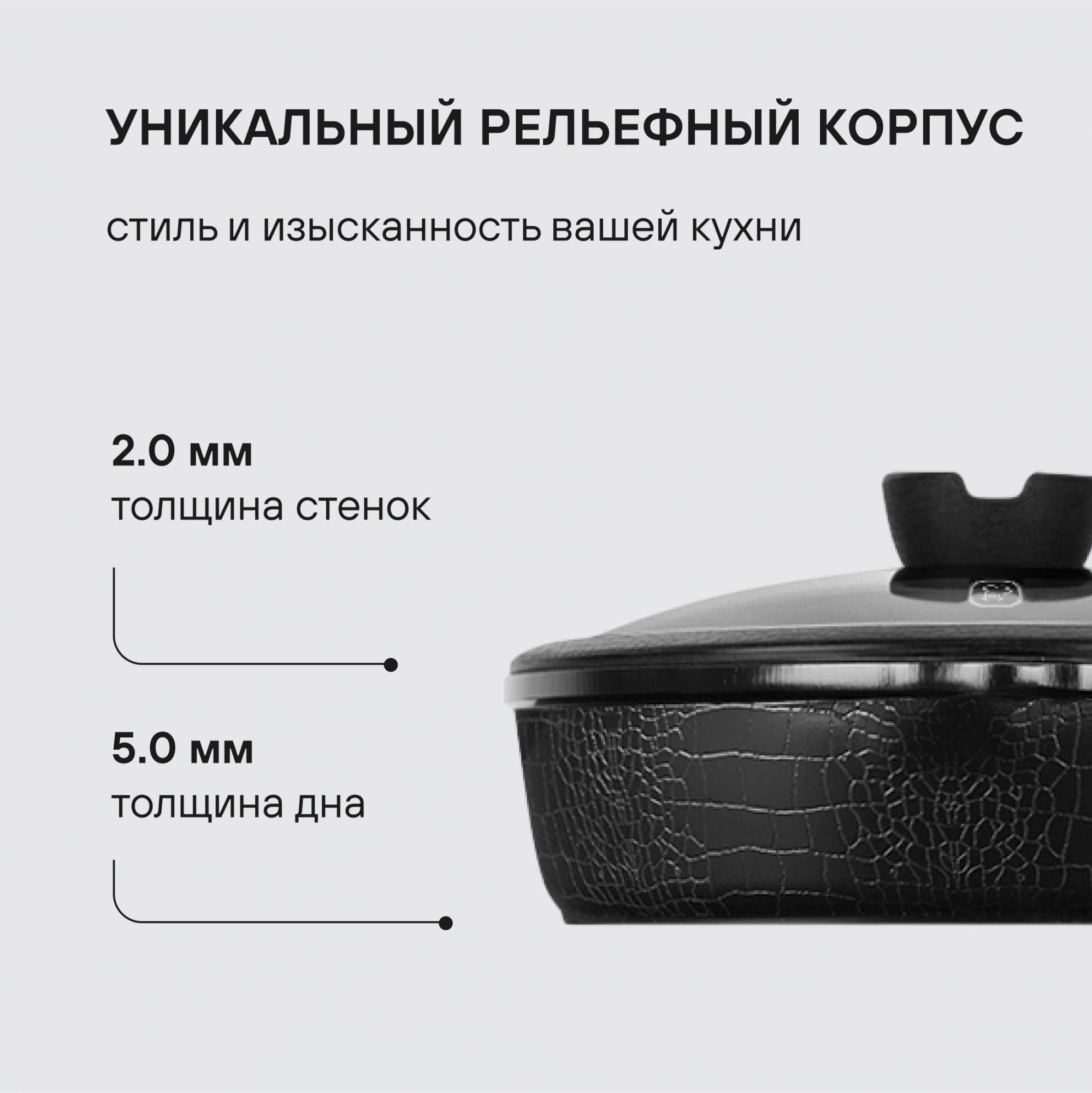Внутреннее покрытие: Xylan® Plus. Cпециальное внешнее термостойкое покрытие для легкого ухода. Аксессуары: съемная надежная бакелитовая ручка. Преимущества: цельный индукционный диск; Уникальный внешний декор поверхности сковороды - стилизация под кожу земноводных.