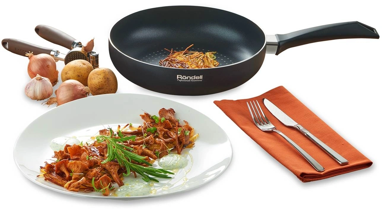Технология: оригинальный принт на дне сковороды. Аксессуары: из бакелита с покрытием Soft Touch. Преимущества: равномерное распределение температуры в процессе приготовления блюд; Равномерная толщина стенок и дна посуды; Клепочное крепление аксессуаров. Упаковка: картонный рукав.