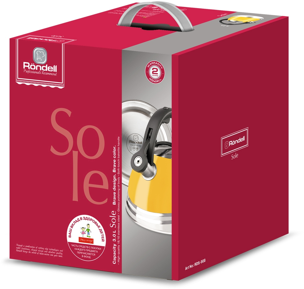 Специальное глянцевое термостойкое покрытие. Аксессуары: из бакелита с покрытием Soft Touch. Преимущества: капсулированное дно. Возможность налива воды одной рукой. Бакелитовый свисток со стальной сердцевиной и устройством для открывания носика на ручке. Упаковка: подарочная.