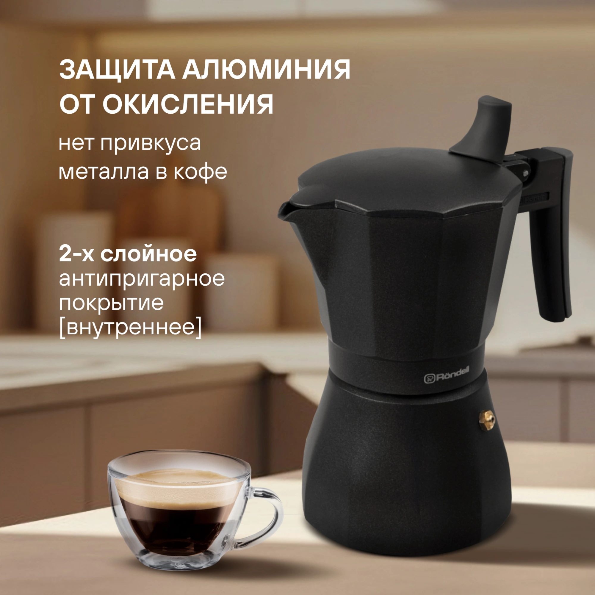 В составе коллекции Kafferro — две гейзерные кофеварки (на 6 и 9 чашек) из литого алюминия, выполненные в благородном темно-сером цвете. Обе имеют уникальное внутреннее двухслойное антипригарное покрытие от PPG, которое не только продлевает их срок службы, но и делает уход за ними легким и приятным.
