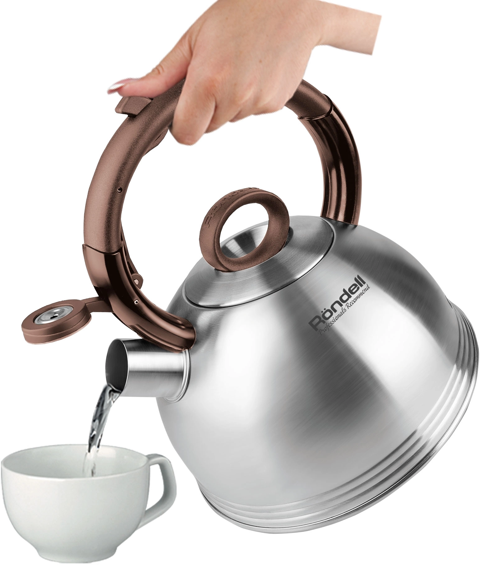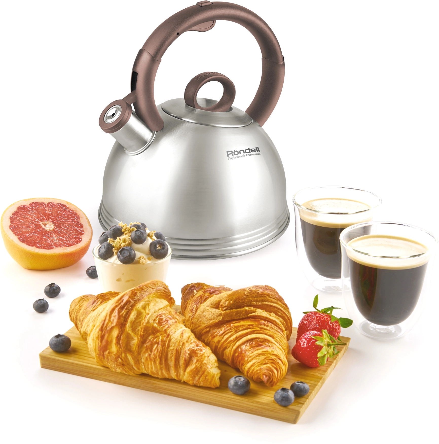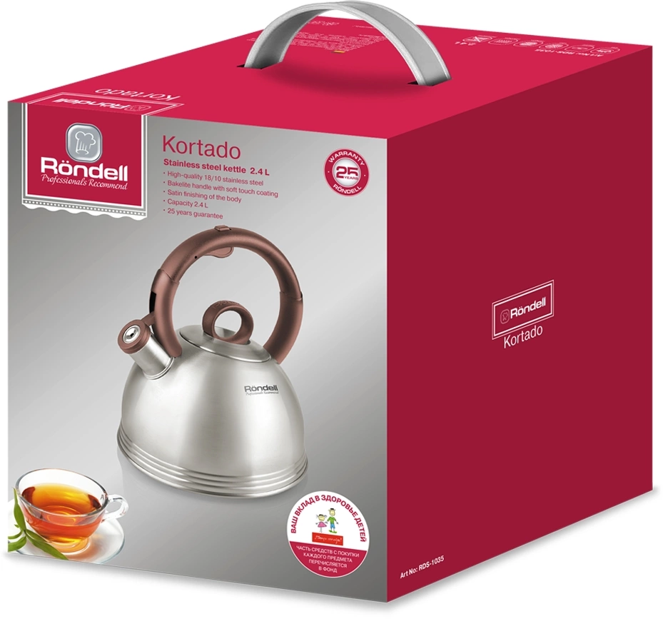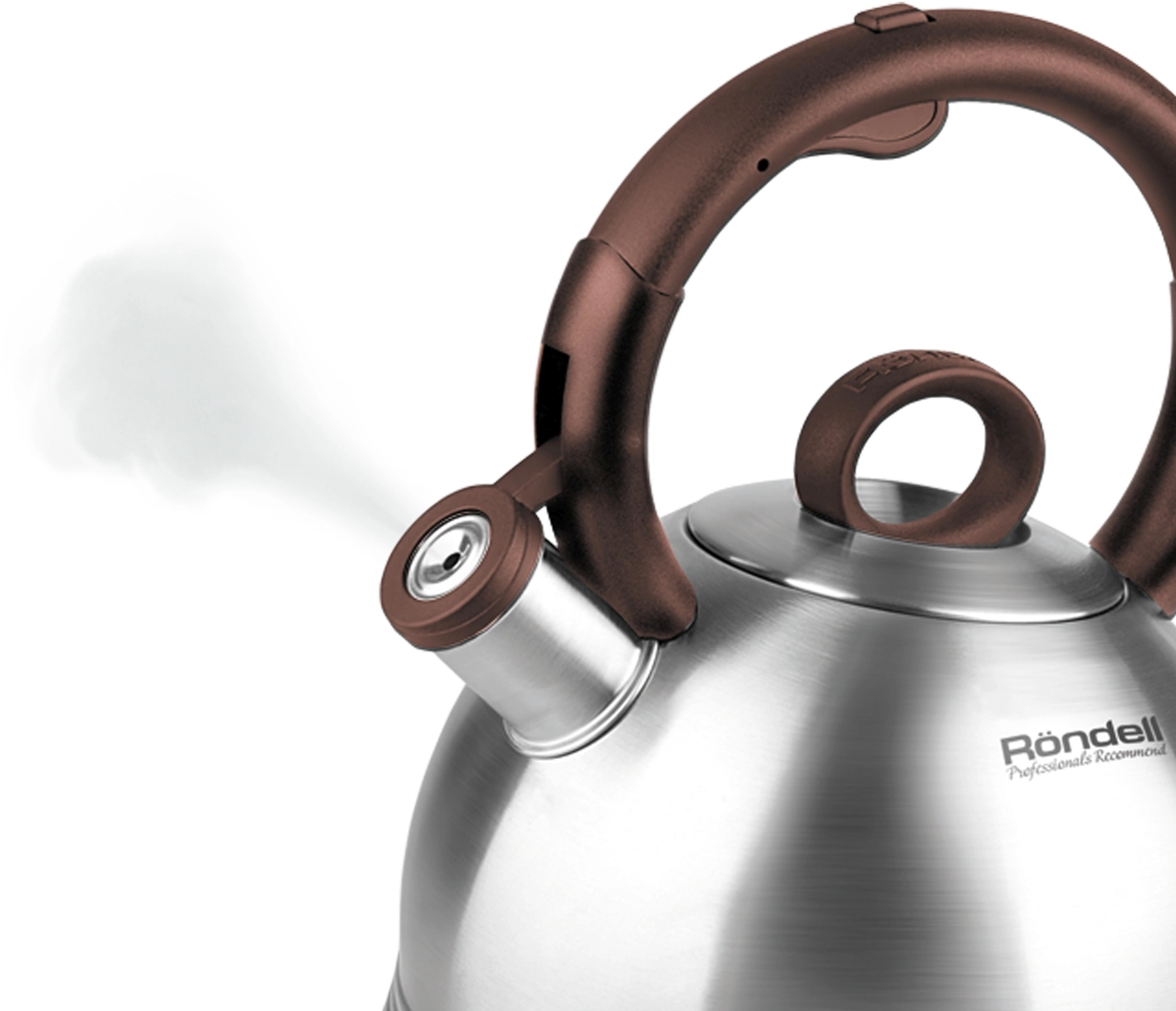Изысканная сатинированная полировка корпуса. Аксессуары: из бакелита с покрытием Soft Touch. Преимущества: возможность налива воды одной рукой. Бакелитовый свисток со стальной сердцевиной и устройством для открывания носика на ручке. Упаковка: подарочная коробка.
