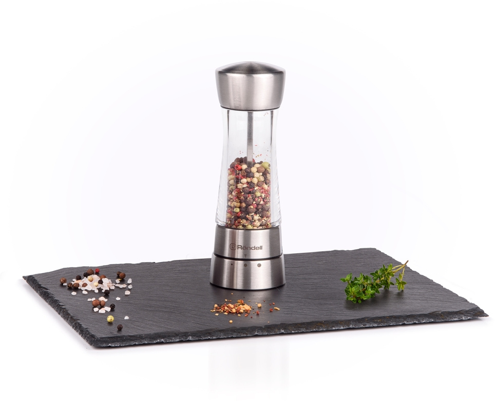 Регулируемая степень помола - 3 уровня. Прозрачный контейнер для специй. Материал: нержавеющая сталь и акрил, Керамические жернова. Режим работы: механика. Вместимость: 47 гр черного перца горошком. Сохраняет рабочую поверхность в идеальной чистоте, благодаря жерновам, расположенным сверху.