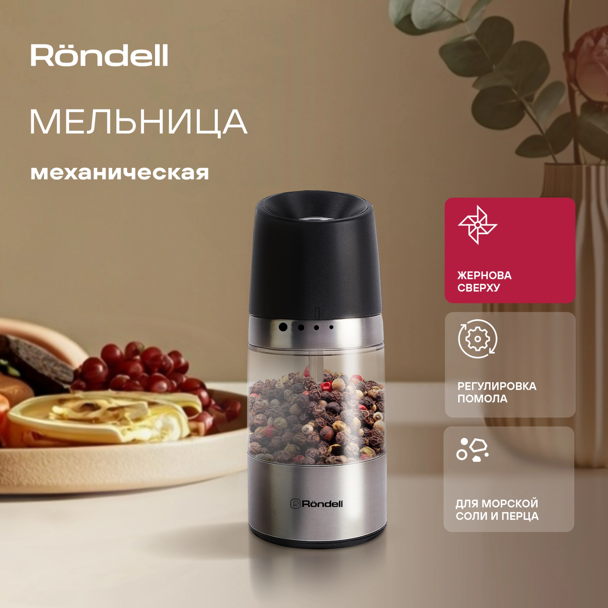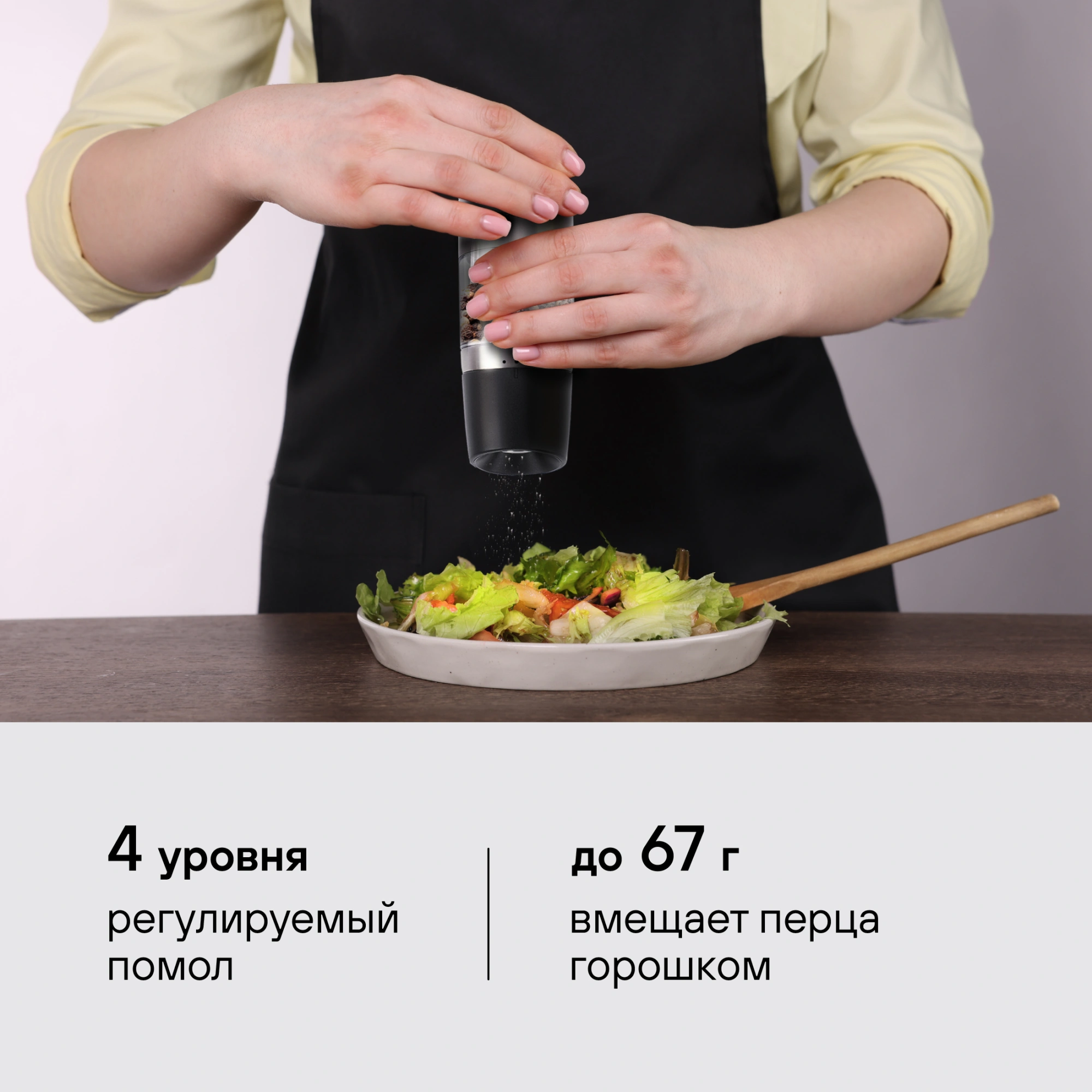 Регулируемая степень помола - 4 уровня. Вместительный контейнер для специй. Предназначен для измельчения перца или морской соли. Жернова расположены сверху: не оставляет остатков специй на столе. Материал: Нержавеющая сталь и пластик. Керамические жернова. Механика. Вместимость: 67гр перца горошком